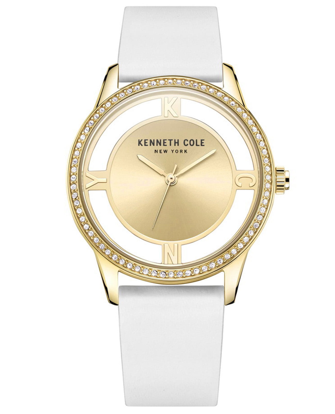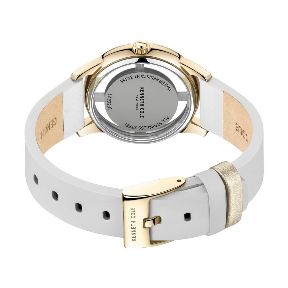 Женские кварцевые часы Kenneth Cole KCWLA2220106 — это изысканный аксессуар, сочетающий элегантность и современный дизайн. Корпус диаметром 36 мм выполнен из стали с IP-покрытиемIP-покрытиеМетод ионного напыления. Демонстрирует повышенную устойчивость к истиранию, окислению и химическим веществам. Под воздействием высокого давления и температуры около 1500°C молекулы металла надёжно соединяются с частицами корпуса часов. золотого цвета. Циферблат украшен вставками из стразов из стекла, придающими сияние и женственность. Циферблат защищён минеральным стекломМинеральное стеклоМинеральное стекло представляет собой искусственно выращенный минерал кварца. Такое стекло отличается особой устойчивостью к повреждениям и царапинам. Уступает по некоторым качествам сапфировому стеклу.. Особенностью модели является прозрачный корпус, добавляющий оригинальности дизайну. Часы оснащены ремешком из натуральной кожи белого цвета с классической пряжкой. Водонепроницаемость 30 м позволяет использовать часы в повседневных условиях, защищая от случайных брызг и капель дождя. Утончённый стиль и необычные детали делают эти часы идеальным выбором для тех, кто ценит индивидуальность.