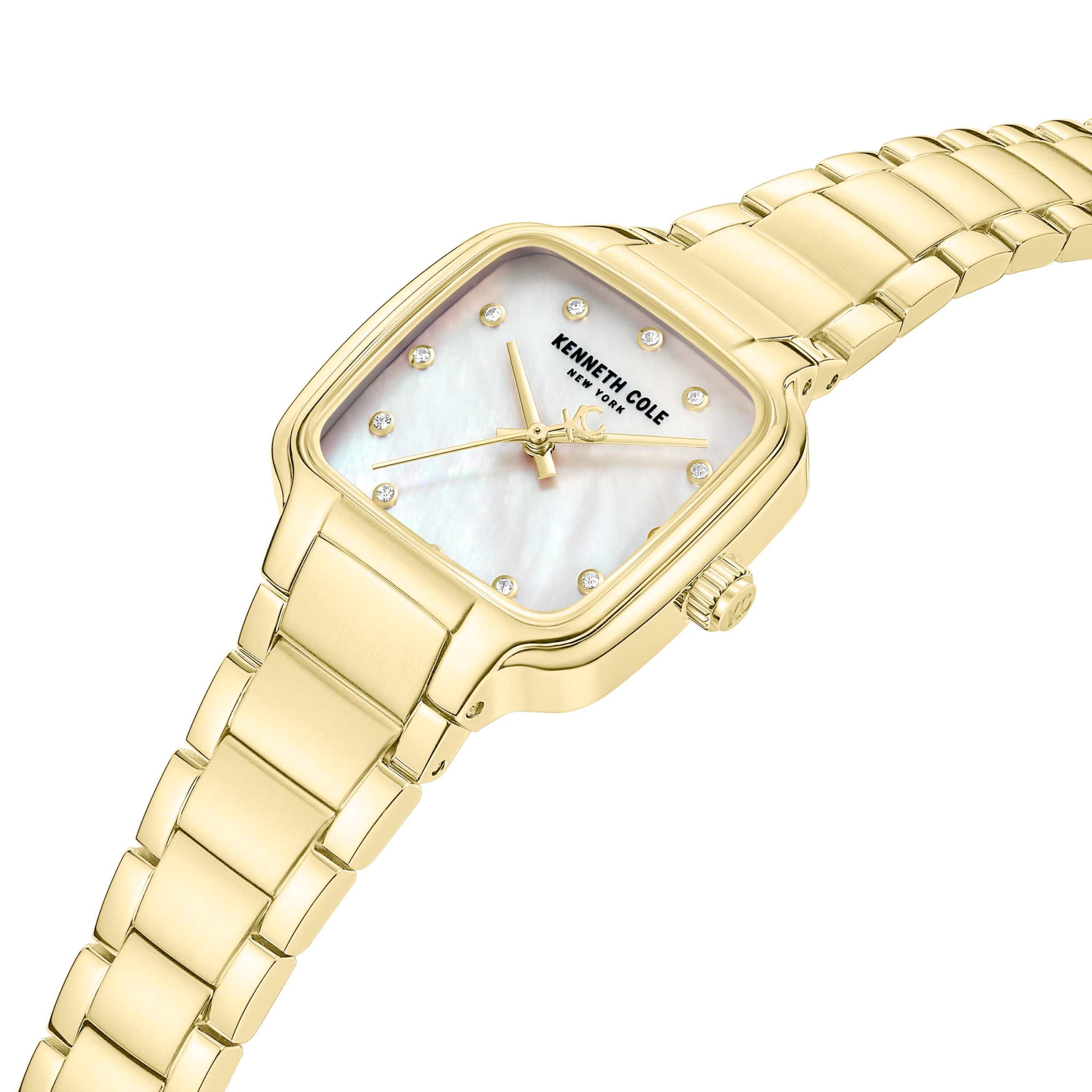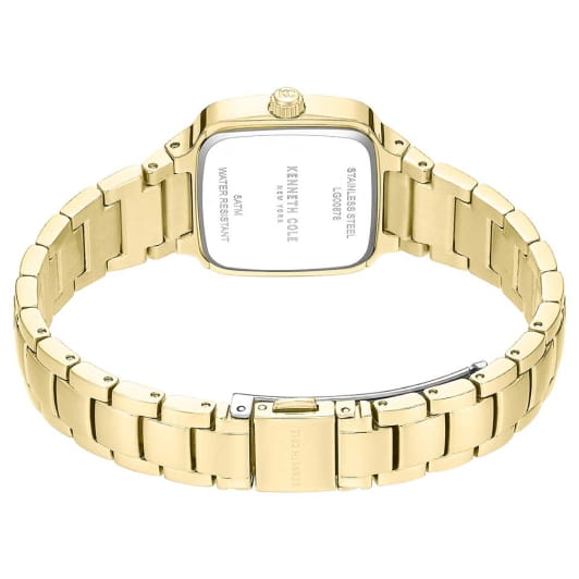 Женские кварцевые часы Kenneth Cole — это элегантный и выразительный аксессуар. Корпус размером 28 мм выполнен из нержавеющей стали 316L с IP-покрытиемIP-покрытиеМетод ионного напыления. Демонстрирует повышенную устойчивость к истиранию, окислению и химическим веществам. Под воздействием высокого давления и температуры около 1500°C молекулы металла надёжно соединяются с частицами корпуса часов. цвета золота. Циферблат белого цвета оформлен индексами и украшен цирконами. Циферблат защищён минеральным стекломМинеральное стеклоМинеральное стекло представляет собой искусственно выращенный минерал кварца. Такое стекло отличается особой устойчивостью к повреждениям и царапинам. Уступает по некоторым качествам сапфировому стеклу.. Часы оснащены стальным браслетом с IP-покрытиемIP-покрытиеМетод ионного напыления. Демонстрирует повышенную устойчивость к истиранию, окислению и химическим веществам. Под воздействием высокого давления и температуры около 1500°C молекулы металла надёжно соединяются с частицами корпуса часов. на раскладной застёжкеРаскладная застёжкаТакой тип застёжки используется только на браслетах из металла. Она никогда не раскрывается полностью, происходит разделение на 2 и более частей. Раскладывающая застёжка снизит вероятность потери часов к минимуму.. Водонепроницаемость 30 м позволяет использовать часы в повседневных условиях. Идеальный выбор для тех, кто ценит стиль, блеск и американское качество.