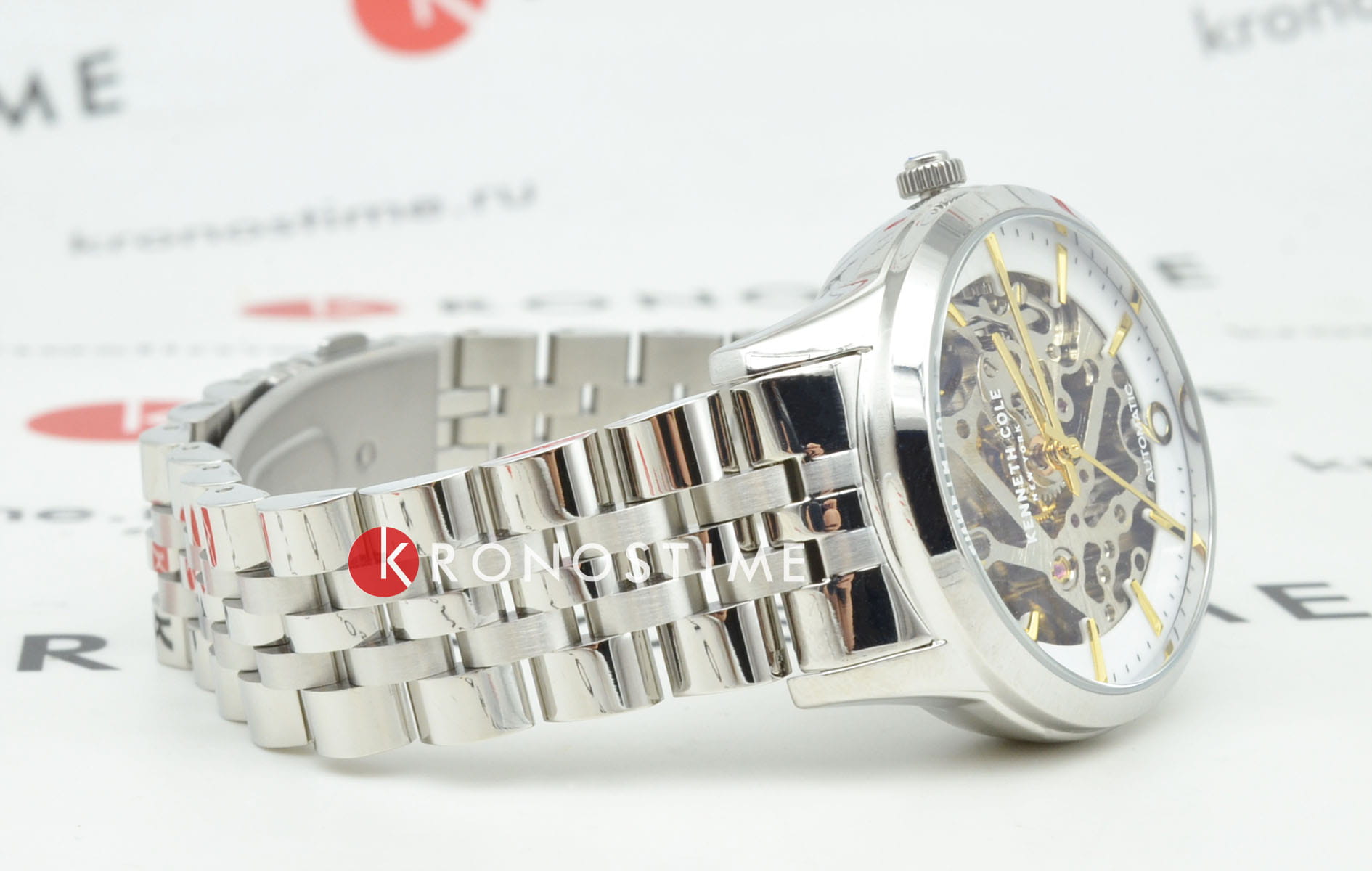 Женские механические часы с автоподзаводом Kenneth Cole KCWLL0047401 — это элегантный аксессуар, сочетающий женственность и современный дизайн. Корпус диаметром 36 мм выполнен из нержавеющей стали. Циферблат белого цвета частично скелетонизирован, что позволяет наблюдать за работой механизма, добавляя модели инженерной изысканности. Циферблат защищён минеральным стекломМинеральное стеклоМинеральное стекло представляет собой искусственно выращенный минерал кварца. Такое стекло отличается особой устойчивостью к повреждениям и царапинам. Уступает по некоторым качествам сапфировому стеклу. и оформлен метками в виде арабских цифр и штрихов. Часы оснащены стальным браслетом с раскладной застёжкойРаскладная застёжкаТакой тип застёжки используется только на браслетах из металла. Она никогда не раскрывается полностью, происходит разделение на 2 и более частей. Раскладывающая застёжка снизит вероятность потери часов к минимуму.. Водонепроницаемость 30 м позволяет использовать часы в повседневных условиях, защищая от случайных брызг и капель дождя. Сочетание лаконичного стиля и надёжного механизма делает эти часы универсальным выбором для повседневного и делового образа.