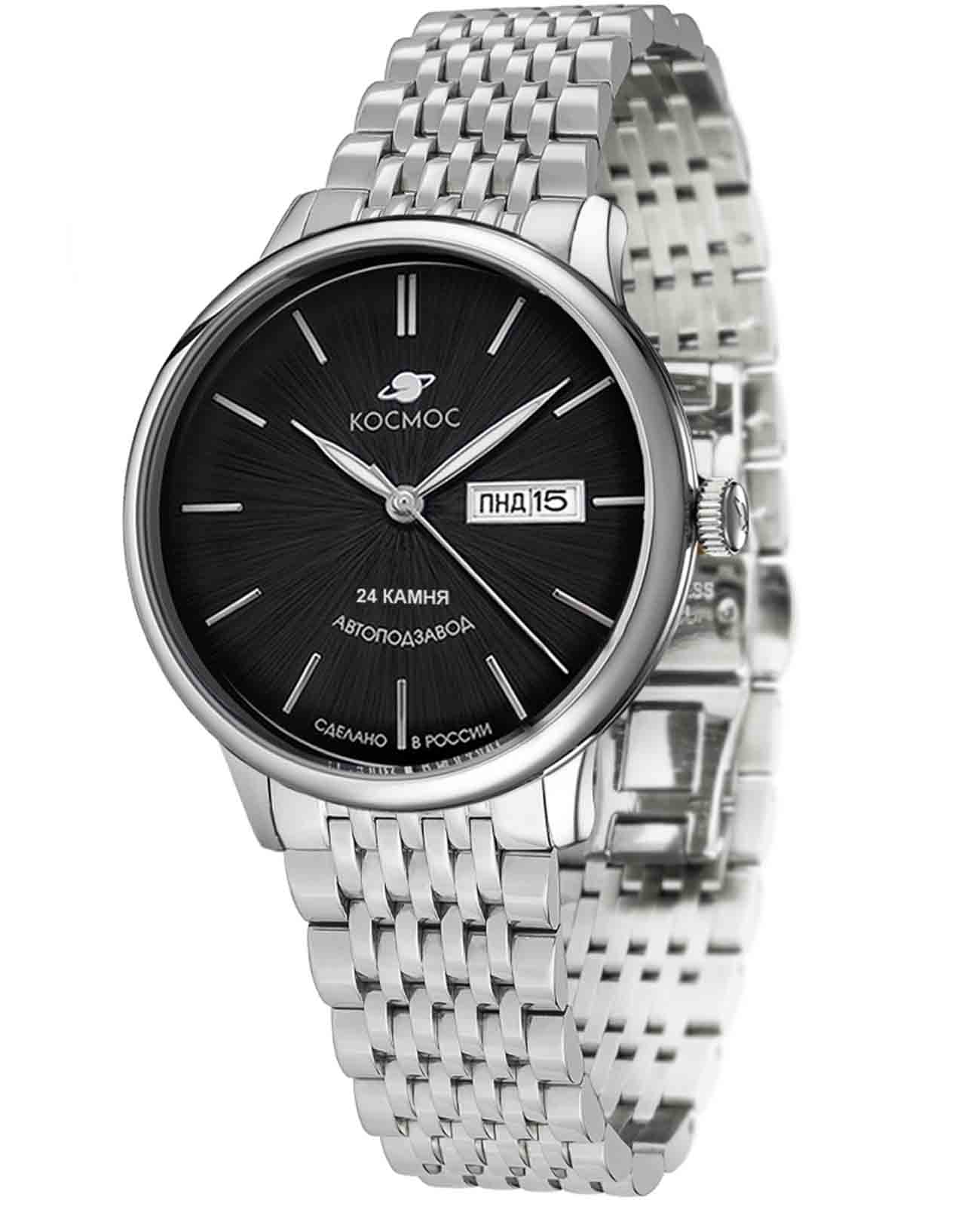Российские мужские механические часы Космос K 043.19.31 из коллекции Юпитер оснащены механизмом TMI с автоподзаводом. Круглый корпус из нержавеющей стали диаметром 41 мм защищен минеральным стекломМинеральное стеклоМинеральное стекло представляет собой искусственно выращенный минерал кварца. Такое стекло отличается особой устойчивостью к повреждениям и царапинам. Уступает по некоторым качествам сапфировому стеклу.. Черный циферблат с элементами стального цвета дополнен функциями отображения даты и дня недели. Часы имеют водонепроницаемость 50 метров, позволит защитить корпус от случайных брызг или капель дождя. Модель комплектуется стальным браслетом на застёжке-бабочке с кнопкамиЗастёжка "бабочка"Такой вид застёжки дополняется предохранителями, помогающими избежать случайного раскрытия браслета. Обладают изящным исполнением. . Прочный корпус и надежный механизм делают эти часы универсальным аксессуаром для повседневного использования. Уникальный дизайн и высокое качество материалов подчеркивают индивидуальность владельца.