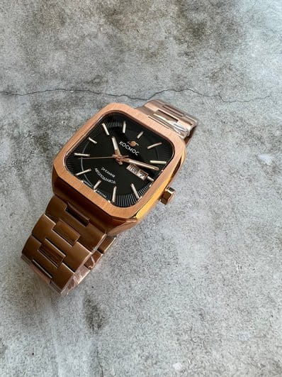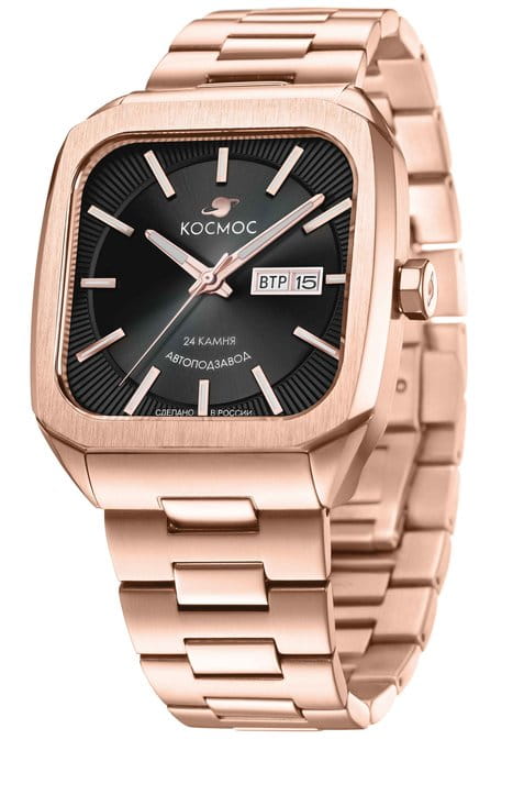 Мужские наручные часы Космос Марсоход K 213.40.31 — это уникальная лимитированная серия, посвященная аппарату, способному передвигаться по поверхности Красной планеты. Марсоход ассоциируется с брутальностью, мастерством и технической сложностью. Наша страна дважды запускала подобные аппараты еще в 70-х годах прошлого века. Дизайн часов серии Марсоход вдохновлен лучшими работами советских мастеров, сочетая современные технологии часового искусства с обаянием стиля ретро. Корпус в форме квадрата с закругленными углами выполнен из нержавеющей стали с PVDPVDУльтратонкое покрытие наносится в технике вакуумного напыления, сочетает в себе нитрид титана особой прочности со слоем золота или оксида хрома. Несёт в себе декоративную или защитную функцию. покрытием, украшенной зеркальной полировкой и сатинированием. Удобная заводная головка имеет форму гайки, что добавляет модели индустриальный шарм. Задняя крышка прозрачная, закрепленная на четырех винтах, и позволяет увидеть работу механизма TMI с подвижным ротором, на котором гравируется надпись «Сделано в России». Также здесь представлена гравировка с изображением космонавта, придающая часам особую значимость. Водостойкость достигает 10 атм (WR100), что позволяет использовать часы при плавании и других водных видах спорта. На задней крышке указан индивидуальный номер модели в формате от 01/50 до 50/50 (первый выпуск) или от 051/200 до 200/200 (второй выпуск). Объемный циферблат состоит из двух уровней. В центре движутся три стрелки, часовая и минутная из которых имеют люминесцентное покрытиеЛюминесцентное покрытиеПозволяет считывать показания времени в темноте. Производители наносят на стрелки, часовые индексы, безель или поверхность циферблата светонакопительный состав, дающий холодное свечение., позволяющее определять время даже в темноте. Индексы накладные, как и стальная рамка, выделяющая сдвоенное окошко даты и дня недели, где день недели отображается на двух языках — русском и английском. Циферблат защищен прочным сапфировым стеклом с антибликовым покрытиемСапфировое стеклоПрочный и надёжный материал из кристалла сапфира синтетического происхождения, характеризующийся особой твёрдостью и устойчивостью к царапинам и повреждениям., обеспечивающим отличную читаемость показаний в любых условиях. Браслет изготовлен из литых стальных звеньев нержавеющей стали и оснащен удобной застёжкой «бабочка» с кнопкамиЗастёжка "бабочка"Такой вид застёжки дополняется предохранителями, помогающими избежать случайного раскрытия браслета. Обладают изящным исполнением. , которая сводит к минимуму вероятность потери. Заводная головка, застежка и браслет украшены фирменным логотипом бренда. Коллекция Марсоход — идеальный выбор для ценителей истории космических достижений и современных технологий.