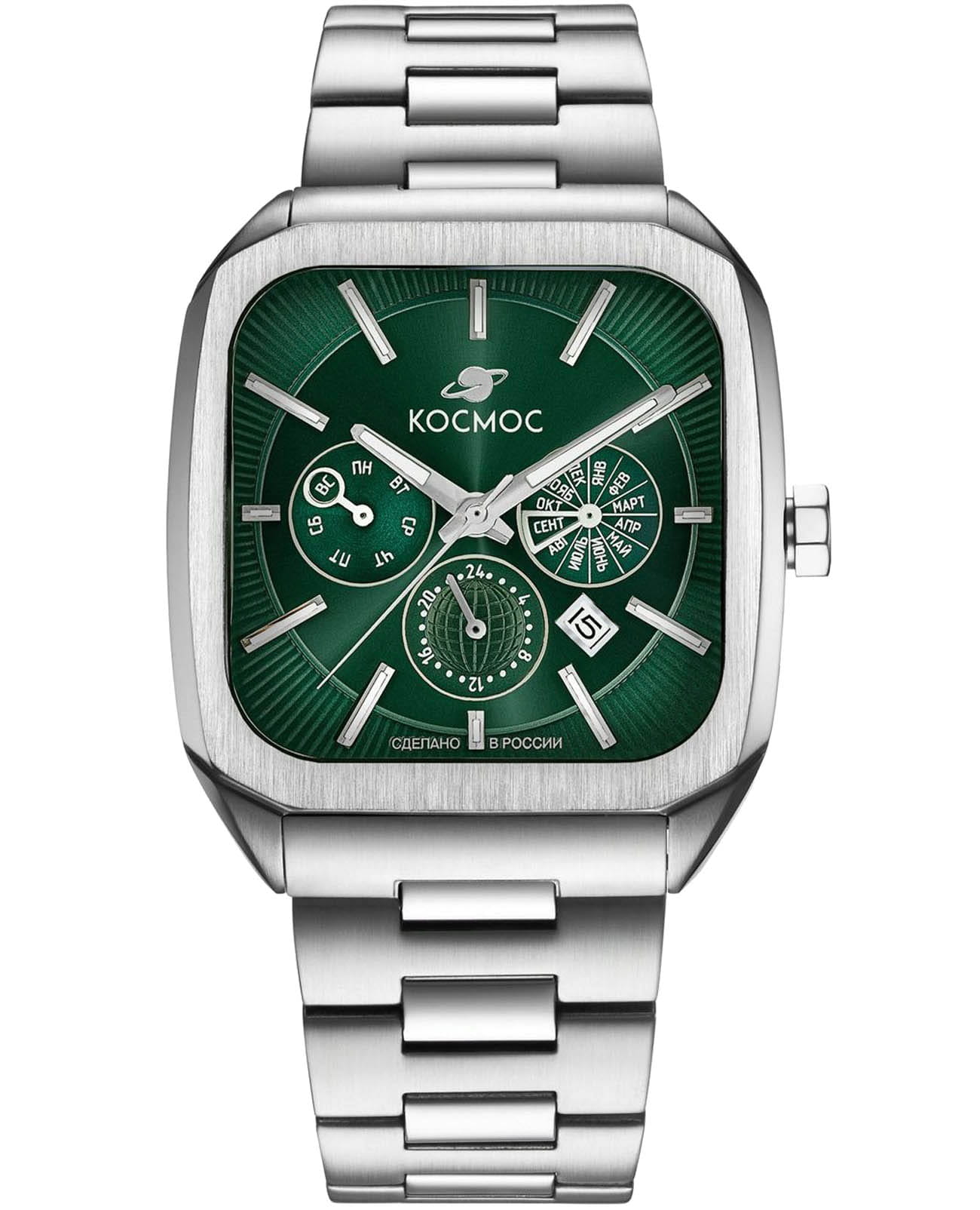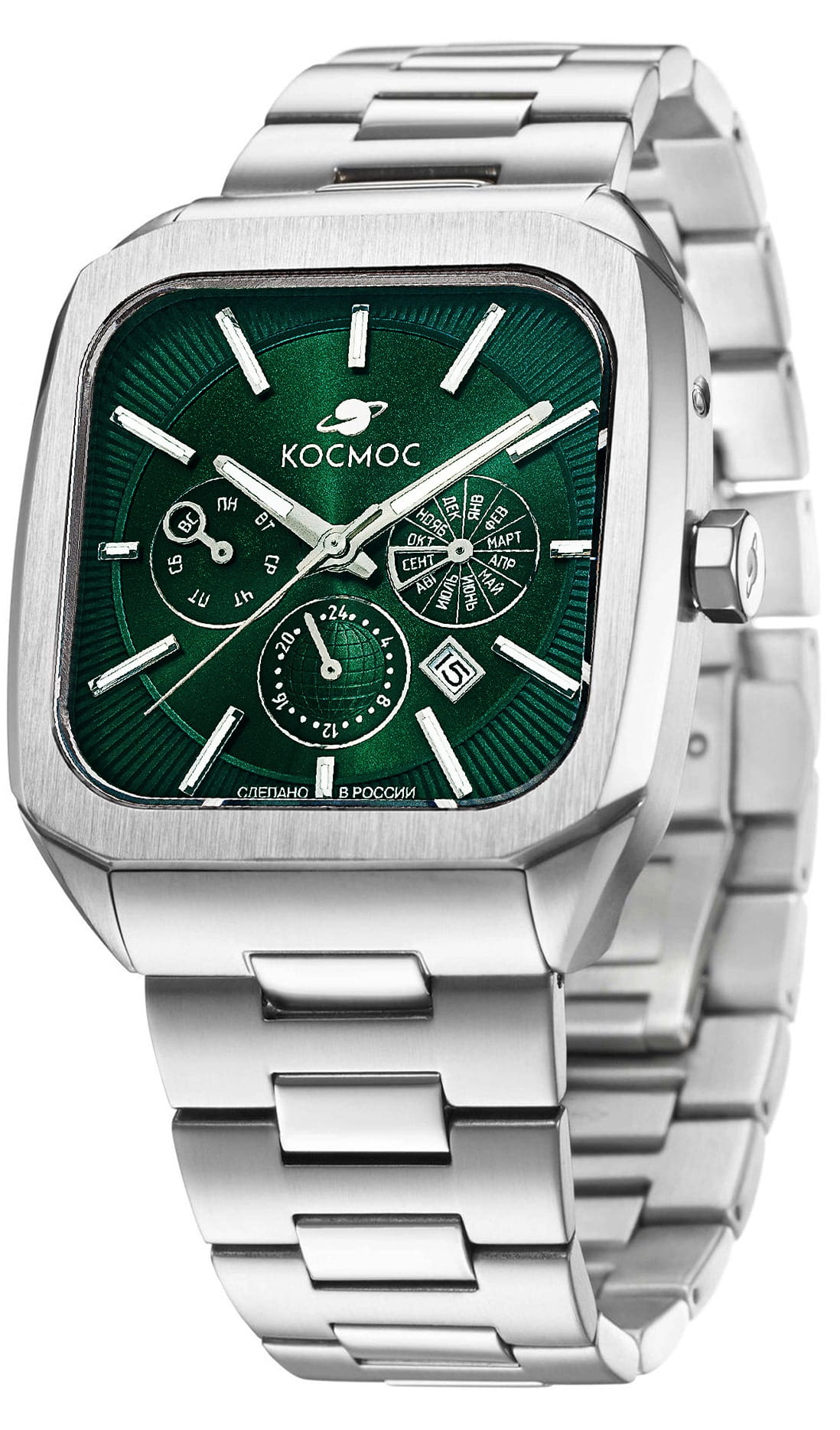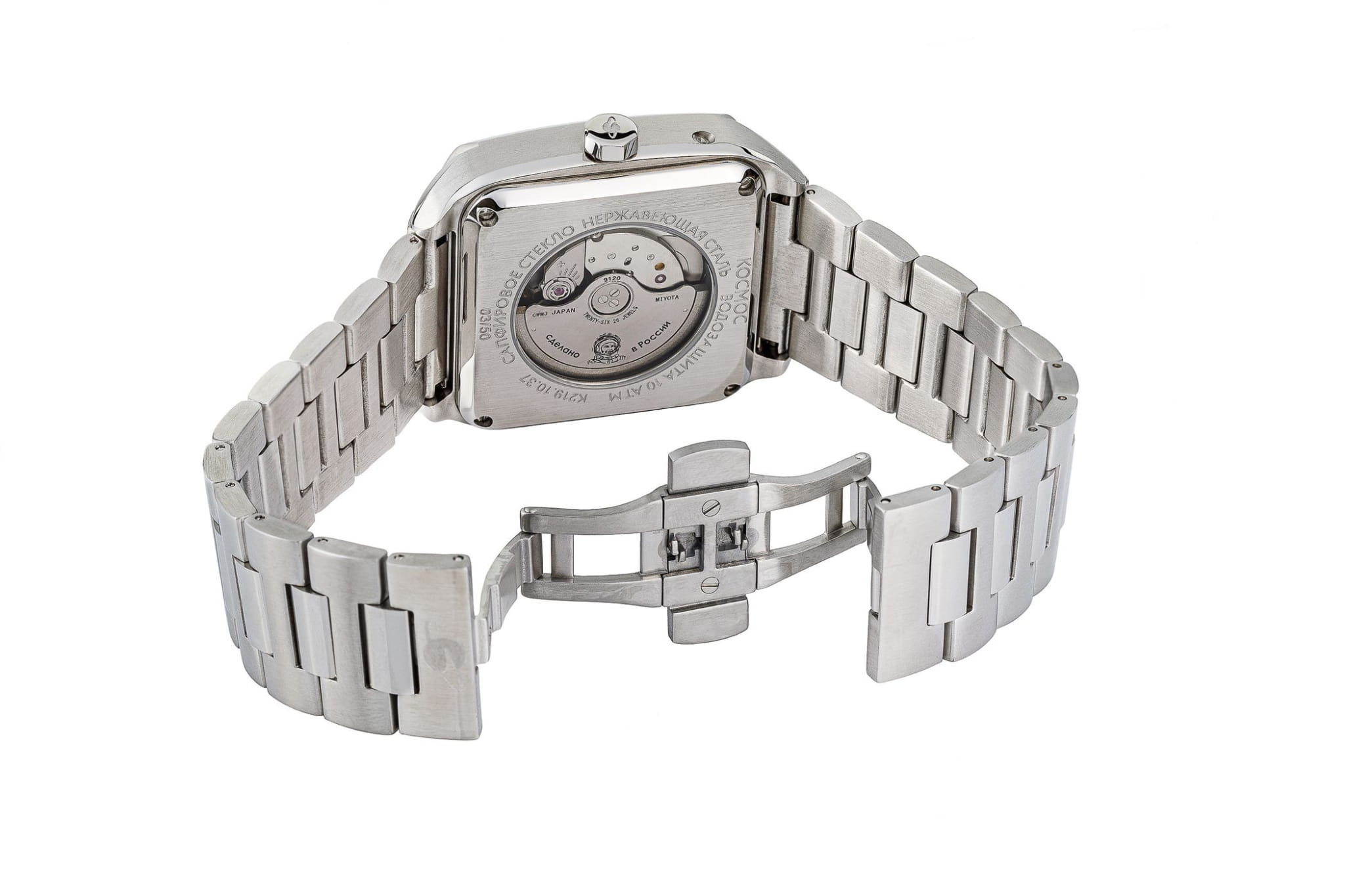 Мужские наручные часы Космос Марсоход II K 219.10.37 — это уникальная лимитированная серия, посвященная аппарату, способному передвигаться по поверхности Красной планеты. Марсоход ассоциируется с брутальностью, мастерством и технической сложностью. Наша страна дважды запускала подобные аппараты еще в 70-х годах прошлого века. Дизайн часов серии Марсоход вдохновлен лучшими работами советских мастеров, сочетая современные технологии часового искусства с обаянием стиля ретро. Корпус в форме квадрата с закругленными углами выполнен из нержавеющей стали украшенной зеркальной полировкой и сатинированием. Удобная заводная головка имеет форму гайки, что добавляет модели индустриальный шарм. Задняя крышка прозрачная, закрепленная на четырех винтах, и позволяет увидеть работу механизма TMI с подвижным ротором, на котором гравируется надпись «Сделано в России». Также здесь представлена гравировка с изображением космонавта, придающая часам особую значимость. Водостойкость достигает 10 атм (WR100), что позволяет использовать часы при плавании и других водных видах спорта. На задней крышке указан индивидуальный номер модели в формате от 01/50 до 50/50. Объемный циферблат состоит из двух уровней. В центре движутся три стрелки, часовая и минутная из которых имеют люминесцентное покрытиеЛюминесцентное покрытиеПозволяет считывать показания времени в темноте. Производители наносят на стрелки, часовые индексы, безель или поверхность циферблата светонакопительный состав, дающий холодное свечение., позволяющее определять время даже в темноте. Также, здесь расположили три дополнительных индикатора: день недели, месяц и время в формате 24-х часов. Для обозначения дня недели и месяца используется кириллица. Окошко даты между 4 и 5 часами выделено накладной рамкой. Циферблат защищен прочным сапфировым стеклом с антибликовым покрытиемСапфировое стеклоПрочный и надёжный материал из кристалла сапфира синтетического происхождения, характеризующийся особой твёрдостью и устойчивостью к царапинам и повреждениям., обеспечивающим отличную читаемость показаний в любых условиях. Второй уровень декорирован гильоше в виде солнечных лучей, на нем закреплены накладные индексы. Браслет изготовлен из литых стальных звеньев нержавеющей стали и оснащен удобной застёжкой «бабочка» с кнопкамиЗастёжка "бабочка"Такой вид застёжки дополняется предохранителями, помогающими избежать случайного раскрытия браслета. Обладают изящным исполнением. , которая сводит к минимуму вероятность потери. Заводная головка, застежка и браслет украшены фирменным логотипом бренда. Коллекция Марсоход — идеальный выбор для ценителей истории космических достижений и современных технологий.