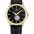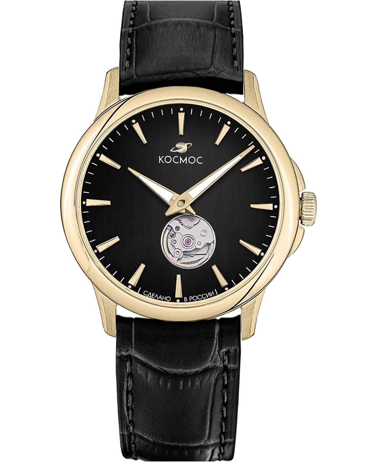 Мужские наручные часы Космос Телескоп K 304.21.31 —  это уникальная лимитированная серия под названием Телескоп, посвящена аппарату приоткрывающего взгляду бескрайние дали космического пространства. Апертура открытого баланса модели по форме напоминает круглую линзу телескопа. Сквозь это окошко, расположенное на черном циферблате, также можно увидеть много интересного: ту самую систему «баланс-спираль» автоматического механизма, которая отвечает за точность хода. Корпус часов выполнен из нержавеющей стали с PVDPVDУльтратонкое покрытие наносится в технике вакуумного напыления, сочетает в себе нитрид титана особой прочности со слоем золота или оксида хрома. Несёт в себе декоративную или защитную функцию. покрытием, классической круглой формы и достаточно тонкий для механических моделей. Это стало возможным благодаря использованию механизма Miyota, калибр 9029, с высотой всего 3.9 мм. Циферблат декорирован вертикальной текстурой в ретро-стиле, по которой движутся крупные часовая и минутная стрелки, имеющие люминесцентное покрытиеЛюминесцентное покрытиеПозволяет считывать показания времени в темноте. Производители наносят на стрелки, часовые индексы, безель или поверхность циферблата светонакопительный состав, дающий холодное свечение., позволяющее определять время даже в темноте. Циферблат защищен прочным сапфировым стеклом с антибликовым покрытиемСапфировое стеклоПрочный и надёжный материал из кристалла сапфира синтетического происхождения, характеризующийся особой твёрдостью и устойчивостью к царапинам и повреждениям., обеспечивающим отличную читаемость показаний в любых условиях. Прозрачная задняя крышка, закрепленная на четырех винтах, демонстрирует механизм и содержит выгравированный индивидуальный номер экземпляра  хх/50, отражающий лимитированный тираж всего в 50 штук. Ремешок часов сделан из натуральной кожи черного цвета и оснащен удобной застёжкой «бабочка» с кнопкамиЗастёжка "бабочка"Такой вид застёжки дополняется предохранителями, помогающими избежать случайного раскрытия браслета. Обладают изящным исполнением. , которая сводит к минимуму вероятность потери. Модель Телескоп сочетает классический дизайн и универсальность, прекрасно подходя как к деловому костюму, так и к более повседневным образам.