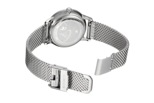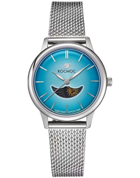 Женские наручные часы Космос Солнце и Луна K 617.19.39 M оснащены кварцевым механизмом, обеспечивающим точность хода, а также функциями отображения даты и индикатора фаз Луны для повседневного удобства. Люминесцентное покрытиеЛюминесцентное покрытиеПозволяет считывать показания времени в темноте. Производители наносят на стрелки, часовые индексы, безель или поверхность циферблата светонакопительный состав, дающий холодное свечение. стрелок и контура циферблата обеспечивает их свечение в темноте. Циферблат с выпуклой формой и шлифовкой в виде солнечных лучей изготовлен с применением сложных технологий, характерных для ретро-моделей. Минеральное стекло минеральное стеклоМинеральное стеклоМинеральное стекло представляет собой искусственно выращенный минерал кварца. Такое стекло отличается особой устойчивостью к повреждениям и царапинам. Уступает по некоторым качествам сапфировому стеклу. выгнуто как снаружи, так и изнутри, чтобы избежать искажений изображения. Корпус и браслет выполнены из нержавеющей стали 316L, устойчивой к коррозии и износу. Браслет миланского плетения шириной 16 мм фиксируется на раскладной застёжкеРаскладная застёжкаТакой тип застёжки используется только на браслетах из металла. Она никогда не раскрывается полностью, происходит разделение на 2 и более частей. Раскладывающая застёжка снизит вероятность потери часов к минимуму.. На задней крышке часов — гравировка в виде космической станции будущего. Водозащита 5 АТМ позволяет использовать часы в условиях случайного контакта с водой. Диаметр корпуса составляет 33 мм, толщина — 11 мм. Гарантия производителя — 24 месяца.