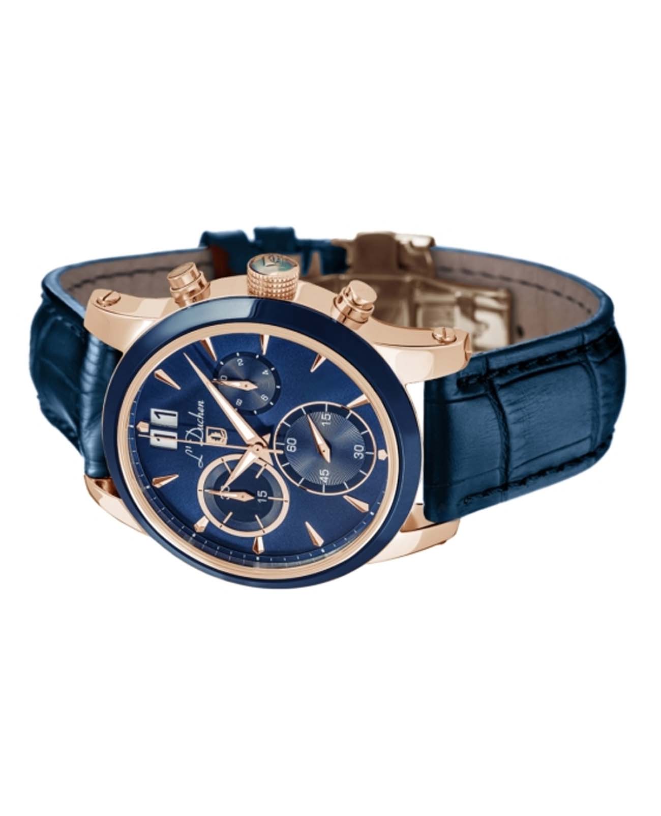Мужские швейцарские часы-хронографХронографФункция позволяет измерять отрезки времени с особой точностью: часы, минуты, секунды. Верным признаком хронографа является наличие на циферблате 3 дополнительных окошек-счётчиков. L'Duchen Aerostat Chrono D 232.46.36, кварцевый механизм с высокой точностью. Сапфировое стеклоСапфировое стеклоПрочный и надёжный материал из кристалла сапфира синтетического происхождения, характеризующийся особой твёрдостью и устойчивостью к царапинам и повреждениям. устойчивое к появлению царапин, обладающее высокой прозрачностью. Корпус часов выполнен из нержавеющей стали с PVD-покрытиемPVDУльтратонкое покрытие наносится в технике вакуумного напыления, сочетает в себе нитрид титана особой прочности со слоем золота или оксида хрома. Несёт в себе декоративную или защитную функцию.. БезельБезельВнешний ободок, закрепляющий стекло. В спортивных часах так называется поворотное кольцо с делениями на циферблате, выполняет роль таймера – замеряет отрезки времени на шкале. Неподвижный безель – элемент декора. Однонаправленно вращающийся безель на дайверских часах позволяет фиксировать моменты погружения и выныривания на поверхность. из керамики. Стрелки с люминесцентным покрытиемЛюминесцентное покрытиеПозволяет считывать показания времени в темноте. Производители наносят на стрелки, часовые индексы, безель или поверхность циферблата светонакопительный состав, дающий холодное свечение.. Класс водозащиты: 100 метров, позволит плавать, нырять и заниматься другими водными видами спорта. Кожаный ремешок на застёжке «бабочка» с кнопкамиЗастёжка "бабочка"Такой вид застёжки дополняется предохранителями, помогающими избежать случайного раскрытия браслета. Обладают изящным исполнением. .