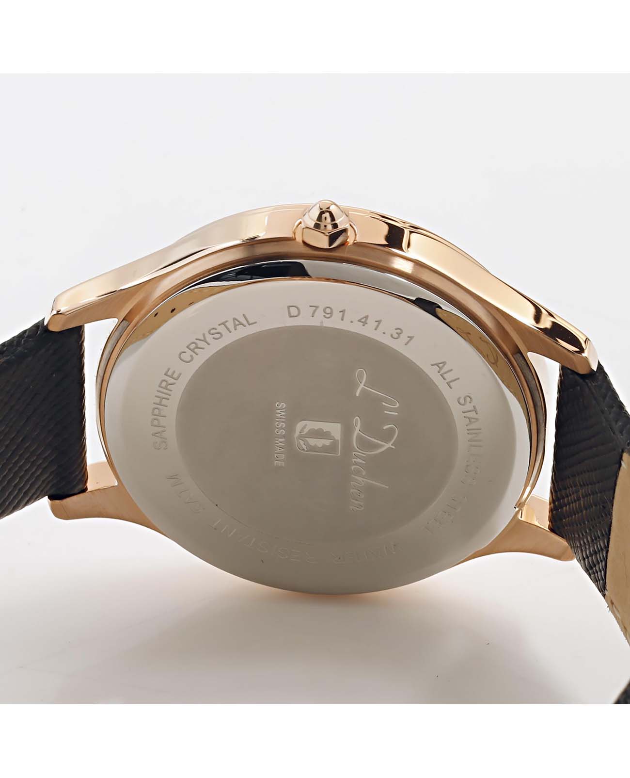 Женские швейцарские часы L'Duchen Grace D 791.41.31, кварцевый механизм с высокой точностью. Сапфировое стеклоСапфировое стеклоПрочный и надёжный материал из кристалла сапфира синтетического происхождения, характеризующийся особой твёрдостью и устойчивостью к царапинам и повреждениям. устойчивое к появлению царапин, обладающее высокой прозрачностью. Корпус часов выполнен из нержавеющей стали с PVD-покрытиемPVDУльтратонкое покрытие наносится в технике вакуумного напыления, сочетает в себе нитрид титана особой прочности со слоем золота или оксида хрома. Несёт в себе декоративную или защитную функцию.. Окошко даты находится в положении 6 часов. Класс водозащиты: 50 метров, позволит защитить корпус от случайных брызг или капель дождя. Кожаный ремешок на застёжке «бабочка» с кнопкамиЗастёжка "бабочка"Такой вид застёжки дополняется предохранителями, помогающими избежать случайного раскрытия браслета. Обладают изящным исполнением. .