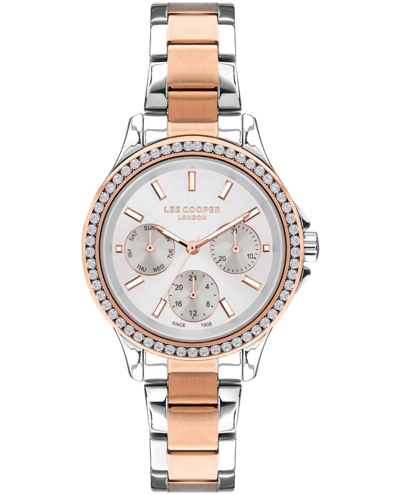 Женские часы Lee Cooper LC07512.530 — это стильное сочетание элегантности и современного дизайна. Круглый корпус диаметром 36 мм выполнен из суперметалла, а неподвижный безельБезельВнешний ободок, закрепляющий стекло. В спортивных часах так называется поворотное кольцо с делениями на циферблате, выполняет роль таймера – замеряет отрезки времени на шкале. Неподвижный безель – элемент декора. Однонаправленно вращающийся безель на дайверских часах позволяет фиксировать моменты погружения и выныривания на поверхность. с IP-покрытиемIP-покрытиеМетод ионного напыления. Демонстрирует повышенную устойчивость к истиранию, окислению и химическим веществам. Под воздействием высокого давления и температуры около 1500°C молекулы металла надёжно соединяются с частицами корпуса часов. цвета розового золота украшен цирконами, придающими модели особый блеск. Серебристый циферблат защищен минеральным стекломМинеральное стеклоМинеральное стекло представляет собой искусственно выращенный минерал кварца. Такое стекло отличается особой устойчивостью к повреждениям и царапинам. Уступает по некоторым качествам сапфировому стеклу., обеспечивающим устойчивость к царапинам. Метки в виде штрихов. Часы оснащены надежным кварцевым механизмом, а металлический браслет с частичным IP-покрытиемIP-покрытиеМетод ионного напыления. Демонстрирует повышенную устойчивость к истиранию, окислению и химическим веществам. Под воздействием высокого давления и температуры около 1500°C молекулы металла надёжно соединяются с частицами корпуса часов. на раскладной застёжкеРаскладная застёжкаТакой тип застёжки используется только на браслетах из металла. Она никогда не раскрывается полностью, происходит разделение на 2 и более частей. Раскладывающая застёжка снизит вероятность потери часов к минимуму. гарантирует комфортную посадку на запястье. Мультифункциональная модель с индикацией даты, дня недели, с дополнительным 24-х часовым индикатором. Стрелки и метки с люминесцентным покрытиемЛюминесцентное покрытиеПозволяет считывать показания времени в темноте. Производители наносят на стрелки, часовые индексы, безель или поверхность циферблата светонакопительный состав, дающий холодное свечение. позволяют легко считывать время даже в условиях недостаточного освещения. Водозащита 30 метров защищает модель от случайных брызг и дождя. Lee Cooper — отличный выбор для тех, кто ценит утонченность и качество.