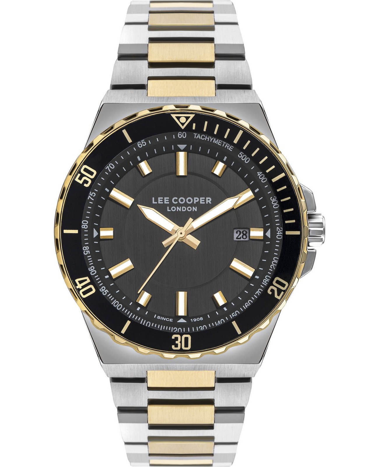 Мужские кварцевые часы Lee Cooper LC07622.260 — это стильный аксессуар с классическим дизайном и спортивными акцентами. Корпус диаметром 45 мм выполнен из суперметалла с частичным IP-покрытиемIP-покрытиеМетод ионного напыления. Демонстрирует повышенную устойчивость к истиранию, окислению и химическим веществам. Под воздействием высокого давления и температуры около 1500°C молекулы металла надёжно соединяются с частицами корпуса часов. жёлтого золота. Циферблат чёрного цвета оформлен индексами и дополнен окошком даты в положении 3 часов. Шкала тахиметраТахиметрРазмеченная шкала, располагается на ободке или безеле часов. Тахиметр позволяет рассчитать скорость на определённом участке пути, расстояние измеряется в километрах или милях. на безеле позволяет измерять среднюю скорость. Циферблат защищён минеральным стекломМинеральное стеклоМинеральное стекло представляет собой искусственно выращенный минерал кварца. Такое стекло отличается особой устойчивостью к повреждениям и царапинам. Уступает по некоторым качествам сапфировому стеклу.. Стрелки и метки с люминесцентным покрытиемЛюминесцентное покрытиеПозволяет считывать показания времени в темноте. Производители наносят на стрелки, часовые индексы, безель или поверхность циферблата светонакопительный состав, дающий холодное свечение., обеспечивающим хорошую читаемость в темноте. Часы оснащены двухцветным стальным браслетом с IP-покрытиемIP-покрытиеМетод ионного напыления. Демонстрирует повышенную устойчивость к истиранию, окислению и химическим веществам. Под воздействием высокого давления и температуры около 1500°C молекулы металла надёжно соединяются с частицами корпуса часов. на раскладной застёжкеРаскладная застёжкаТакой тип застёжки используется только на браслетах из металла. Она никогда не раскрывается полностью, происходит разделение на 2 и более частей. Раскладывающая застёжка снизит вероятность потери часов к минимуму.. Водонепроницаемость 50 м позволяет использовать часы для плавания и повседневного ношения. Универсальный выбор для тех, кто ценит надёжность и выразительный стиль.
