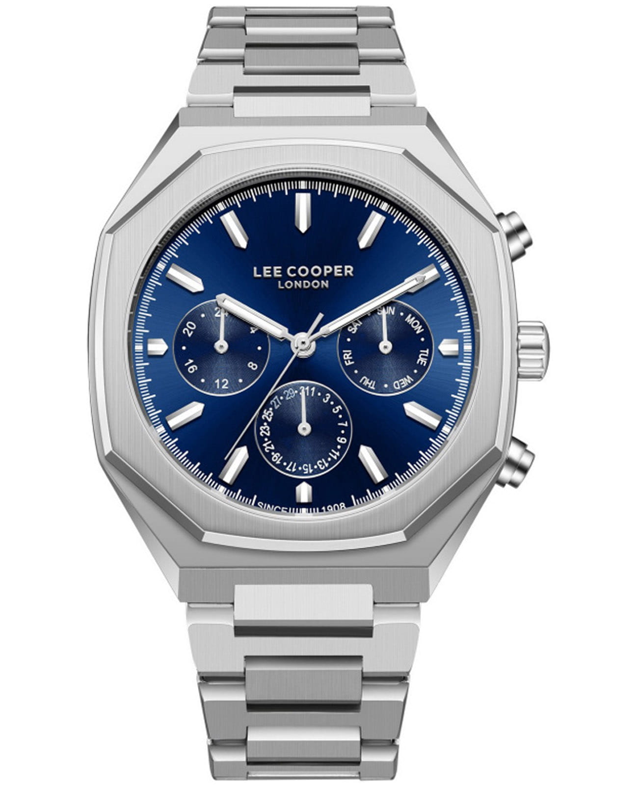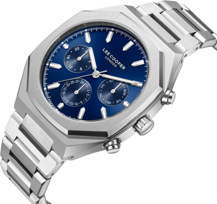 Мужские наручные часы Lee Cooper LC08045.390 — это стильная модель из коллекции Contemporary, сочетающая в себе современный дизайн и функциональность. Часы оснащены кварцевым механизмом японского производства, который обеспечивает высокую точность хода и минимальное энергопотребление. Корпус часов изготовлен из высококачественного суперметалла серебристого цвета, что делает их устойчивыми к внешним воздействиям и придает благородный вид. Синий циферблат украшен стрелками и индексами серебристого цвета, гармонично дополняющими общий дизайн модели. Для защиты циферблата используется минеральное стеклоМинеральное стеклоМинеральное стекло представляет собой искусственно выращенный минерал кварца. Такое стекло отличается особой устойчивостью к повреждениям и царапинам. Уступает по некоторым качествам сапфировому стеклу.,  устойчивое к царапинам и механическим повреждениям. Корпус имеет круглую форму с диаметром 43 мм, что делает часы заметными и подходящими для повседневной носки. Браслет изготовлен из металла серебристого цвета, гармонично дополняя общий дизайн модели. Модель обладает водонепроницаемостью до 50 метров (5 АТМ), что позволяет использовать часы в повседневной жизни, включая контакт с водой при мытье рук или дожде. Эти часы станут идеальным выбором для мужчин, ценящих стиль, качество и функциональность.