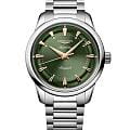 Циферблат глубокого зелёного оттенка оформлен с сатинированной отделкой «солнечные лучи» и украшен накладными индексами и стрелками с покрытием Swiss Super‑LumiNova. Для защиты от повреждений и чёткого отображения показаний используется куполообразное сапфировое стеклоСапфировое стеклоПрочный и надёжный материал из кристалла сапфира синтетического происхождения, характеризующийся особой твёрдостью и устойчивостью к царапинам и повреждениям. с антибликовым покрытием.