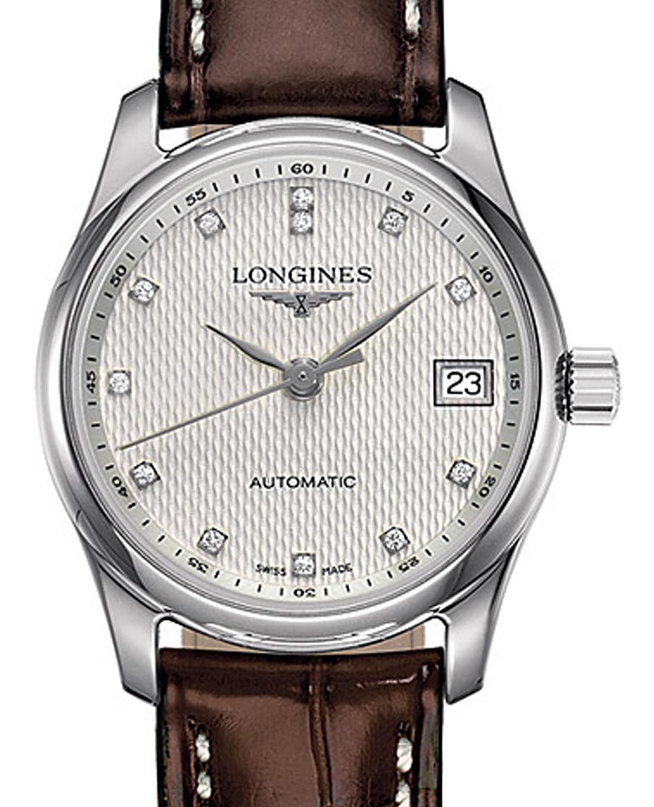 Женские швейцарские механические часы с автоподзаводом Longines Master Collection L2.257.4.77.3. Сапфировое стеклоСапфировое стеклоПрочный и надёжный материал из кристалла сапфира синтетического происхождения, характеризующийся особой твёрдостью и устойчивостью к царапинам и повреждениям. устойчивое к появлению царапин, обладающее высокой прозрачностью. Корпус часов изготовлен из нержавеющей стали. Циферблат инкрустирован 12 бриллиантами. Окошко даты в положении 3 часов. Прозрачная задняя крышка. Класс водозащиты: 30 метров, позволит защитить корпус от случайных брызг или капель дождя. Ремешок из кожи аллигатора на застёжке «бабочка» с кнопкамиЗастёжка "бабочка"Такой вид застёжки дополняется предохранителями, помогающими избежать случайного раскрытия браслета. Обладают изящным исполнением. .