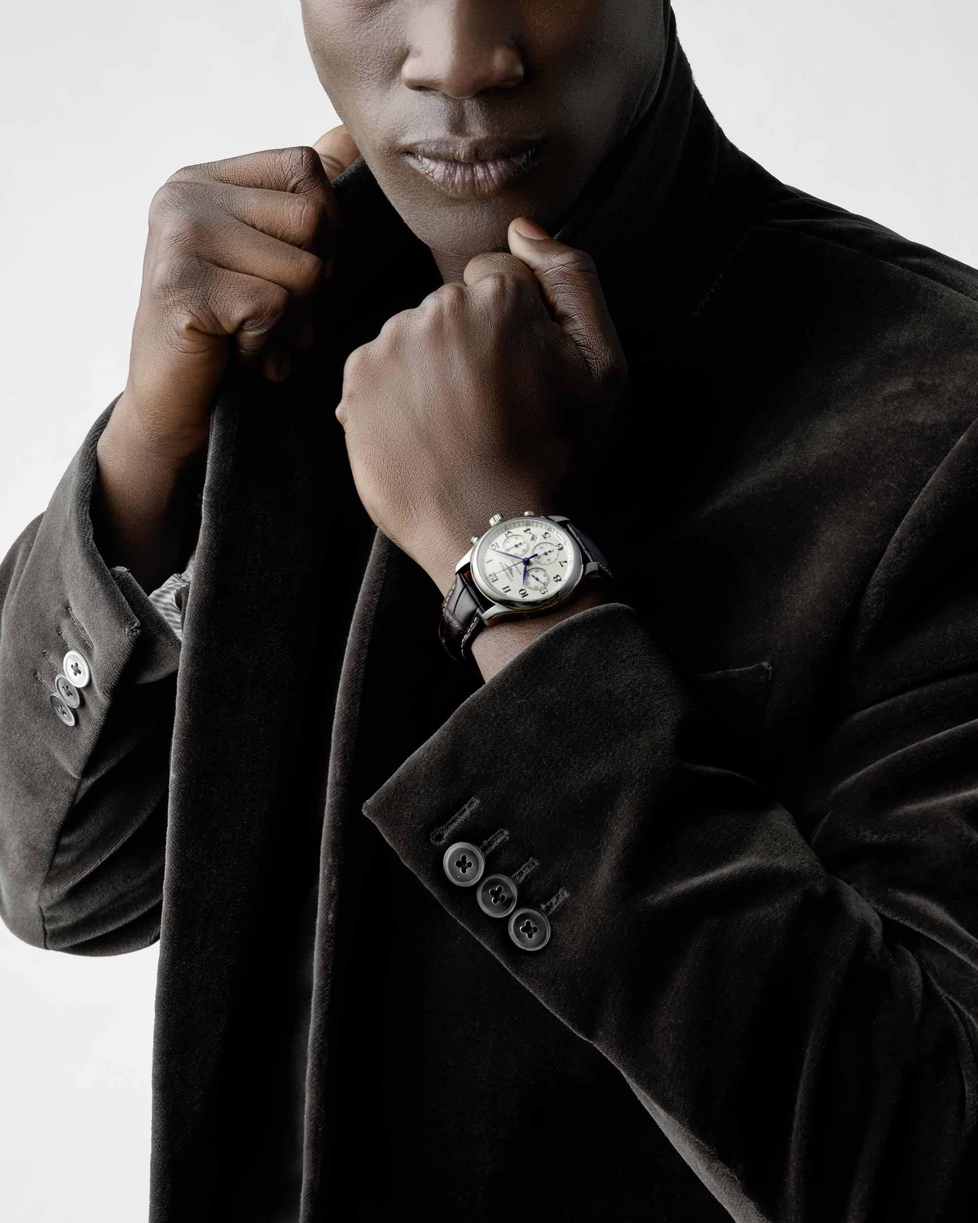 Мужсике швейцарские механические часы-хронографХронографФункция позволяет измерять отрезки времени с особой точностью: часы, минуты, секунды. Верным признаком хронографа является наличие на циферблате 3 дополнительных окошек-счётчиков. с автоподзаводом Longines Master Collection L2.759.4.78.3. Сапфировое стеклоСапфировое стеклоПрочный и надёжный материал из кристалла сапфира синтетического происхождения, характеризующийся особой твёрдостью и устойчивостью к царапинам и повреждениям. устойчивое к появлению царапин, обладающее высокой прозрачностью. Корпус часов изготовлен из нержавеющей стали. Механизм хронографа: центральная секундная стрелка, 30-минутный счетчик в положении «3 часа», 12-часовой счетчик в положении «6 часов». Прозрачная задняя крышка. Автоматический механизм с частотой баланса 28 800 полуколебаний в час и запасом хода, которого хватает примерно на 60 часов работы. Класс водозащиты: 30 метров, позволит защитить корпус от случайных брызг или капель дождя. Автоматический механизм с частотой баланса 28 800 полуколебаний в час и запасом хода, которого хватает примерно на 60 часов работы. Ремешок из кожи аллигатора на застёжке «бабочка» с кнопкамиЗастёжка "бабочка"Такой вид застёжки дополняется предохранителями, помогающими избежать случайного раскрытия браслета. Обладают изящным исполнением. .
