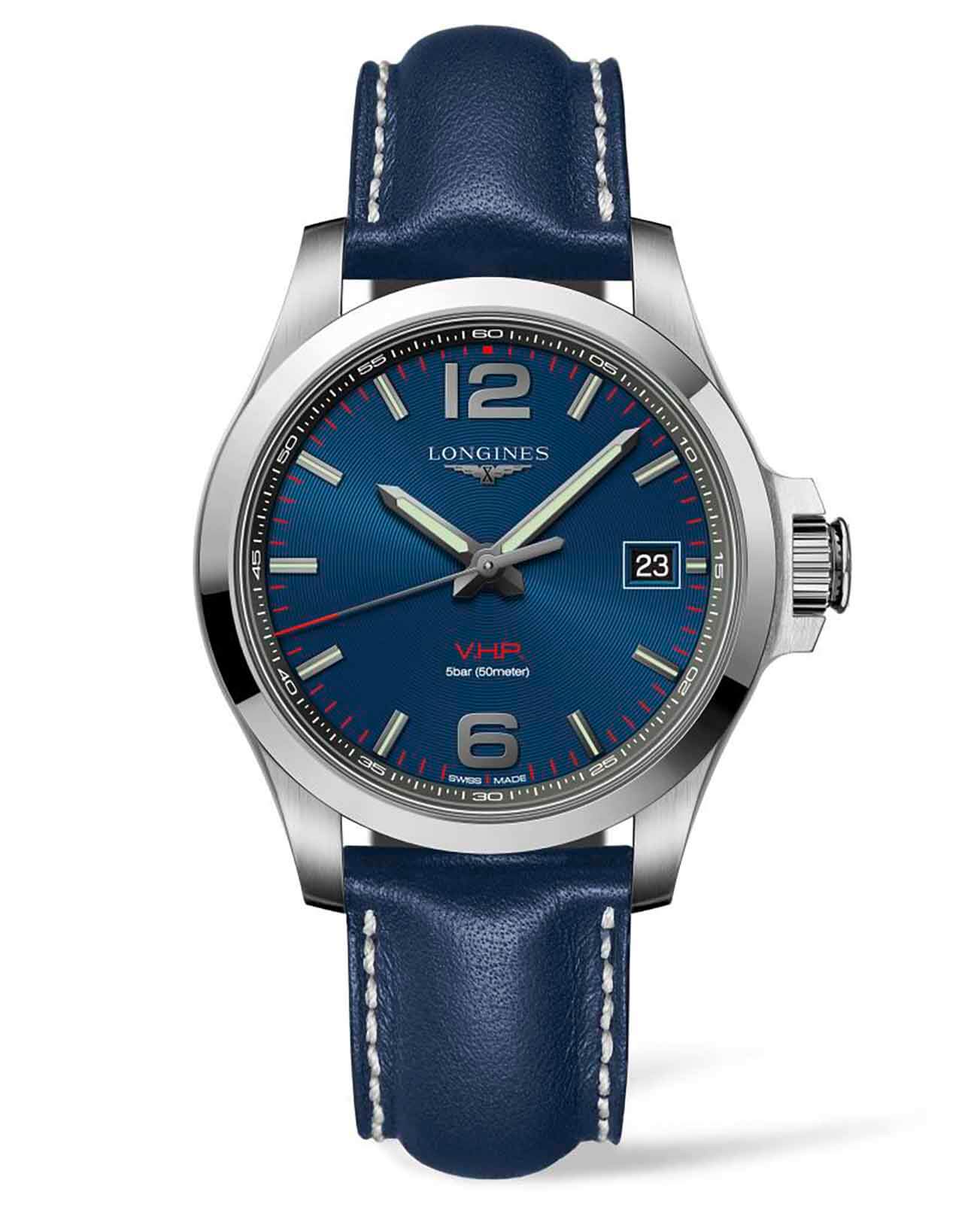 Мужские швейцарские часы Longines Conquest V.H.P. L3.716.4.96.0 станут гармоничным завершением образа. Синий ремешок из кожи стильно смотрится на запястье. Швейцарский кварцевый механизм L288 демонстрирует абсолютную точность хода. Устойчивое к царапинам сапфировое стекло имеет антибликовое покрытиеАнтибликовое покрытиеСлой оксида металла в 0,13-0,3 микрон, благодаря которому стекло часов не бликует и не отражает свет. Антибликовое покрытие уменьшает отражение света в 10 раз, обеспечивая отличную читаемость показателей циферблата.. Функции: вечный календарь, индикатор EOLEOLПредставляет собой систему, уведомляющую владельца часов о необходимости замены элемента питания. За 2 недели до полного разряда батарейки секундная стрелка перестаёт ходить чётко и начинает перепрыгивать на 3-4 деления., хронограф. Производство и сборка: Швейцария.