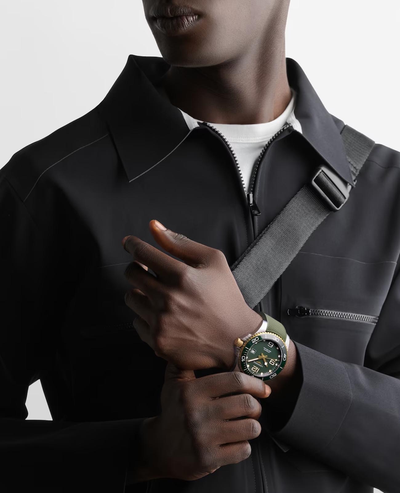 Мужские швейцарские механические часы для дайвинга Longines Hydroconquest L3.782.3.06.9. Сапфировое стеклоСапфировое стеклоПрочный и надёжный материал из кристалла сапфира синтетического происхождения, характеризующийся особой твёрдостью и устойчивостью к царапинам и повреждениям. с многослойным антибликовым покрытием с обеих сторон, устойчивое к появлению царапин, обладающее высокой прозрачностью. Корпус часов изготовлен из стали. Вращающийся безельБезельВнешний ободок, закрепляющий стекло. В спортивных часах так называется поворотное кольцо с делениями на циферблате, выполняет роль таймера – замеряет отрезки времени на шкале. Неподвижный безель – элемент декора. Однонаправленно вращающийся безель на дайверских часах позволяет фиксировать моменты погружения и выныривания на поверхность. из стали с PVD-покрытиемPVDУльтратонкое покрытие наносится в технике вакуумного напыления, сочетает в себе нитрид титана особой прочности со слоем золота или оксида хрома. Несёт в себе декоративную или защитную функцию. и керамики, защищенный от царапин, никогда не изнашивается и не выцветает. Стрелки и метки с люминесцентным покрытиемЛюминесцентное покрытиеПозволяет считывать показания времени в темноте. Производители наносят на стрелки, часовые индексы, безель или поверхность циферблата светонакопительный состав, дающий холодное свечение.. Окошко даты находится в положении 3 часов. Класс водозащиты: 300 метров, позволит плавать, нырять и заниматься другими водными видами спорта. Каучуковый ремешок на раскладной застёжкеРаскладная застёжкаТакой тип застёжки используется только на браслетах из металла. Она никогда не раскрывается полностью, происходит разделение на 2 и более частей. Раскладывающая застёжка снизит вероятность потери часов к минимуму..