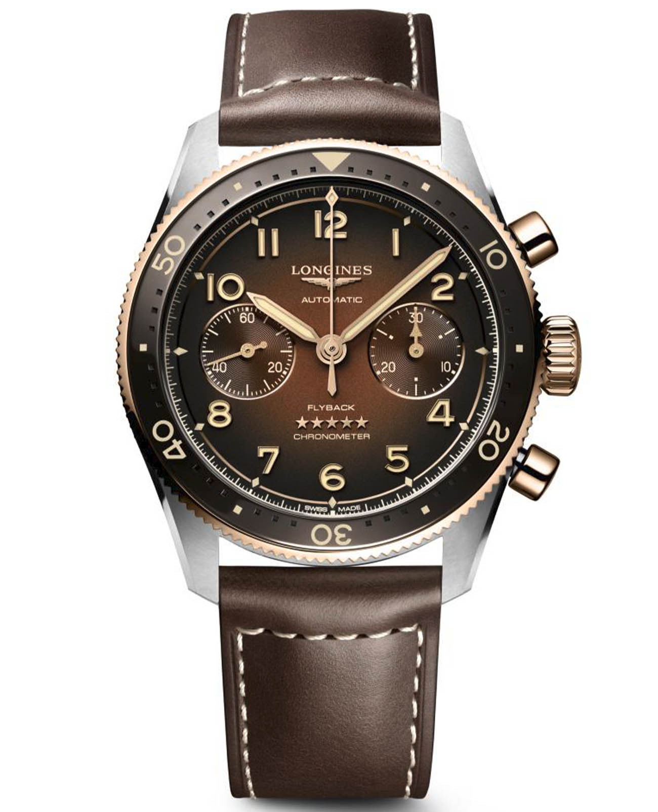 Коллекция Longines Spirit пополнилась часами с функцией Flyback. Эти часы приводятся в движение новым эксклюзивным калибром Longines, устойчивым к магнетизму и оснащенным кремниевой пружиной баланса. Спортивный хронографХронографФункция позволяет измерять отрезки времени с особой точностью: часы, минуты, секунды. Верным признаком хронографа является наличие на циферблате 3 дополнительных окошек-счётчиков. выпущен в честь известных авиаторов, которые раньше тестировали часы Longines. Модель оснащена швейцарским автоматическим механизмом, чрезвычайно точный механизм с запасом хода 68 часов сертифицирован COSCСертификат COSCОфициальный сертификат, подтверждающий то, что часы ходят с особо высокой точностью. Для получения документа часы подвергаются тестовым испытаниям, разработанным швейцарским институтом тестирования хронометров COSC. Допустимая норма для механических часов -4/+6 секунд в день, для кварцевых моделей +/- 0,07 секунд в день.. Дополнительные особенности: сапфировое стеклоСапфировое стеклоПрочный и надёжный материал из кристалла сапфира синтетического происхождения, характеризующийся особой твёрдостью и устойчивостью к царапинам и повреждениям. с двухсторонним антибликовым покрытиемАнтибликовое покрытиеСлой оксида металла в 0,13-0,3 микрон, благодаря которому стекло часов не бликует и не отражает свет. Антибликовое покрытие уменьшает отражение света в 10 раз, обеспечивая отличную читаемость показателей циферблата., люминесцентная подсветкаЛюминесцентное покрытиеПозволяет считывать показания времени в темноте. Производители наносят на стрелки, часовые индексы, безель или поверхность циферблата светонакопительный состав, дающий холодное свечение..На прозрачной задней крышке видны все детали калибра, в том числе персонализированный вес с выгравированным изображением земного шара, символизирующего коллекцию Longines Spirit, и название Longines Flyback. Эта новая модель также отличается утонченной эстетикой и особенно тщательной отделкой, которая включает в себя сатинированные, матовые, полированные и гравированные детали. Он оснащен двунаправленным безелем, дополненным керамической вставкой с люминесцентными метками и циферблатом в виде солнечных лучей.