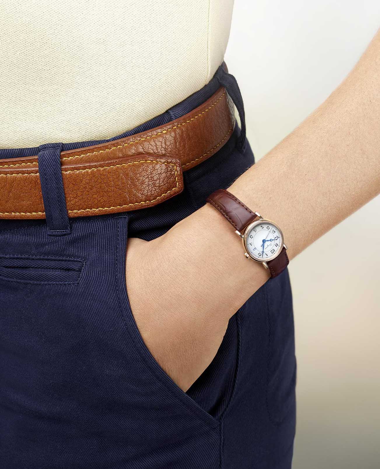 Время указывают винтажные стрелки «Breguet». Ювелирный корпус выполнен из 18-ти каратного розового золота18-каратное золотоОбозначение по каратной системе пробирования, оно показывает, сколько драгоценного металла содержится в изделии. 18 карат - в составе 75% чистого золота, соответствует 750 пробе.