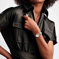 Корпус из нержавеющей стали с утонченным розовым PVD-покрытиемPVDУльтратонкое покрытие наносится в технике вакуумного напыления, сочетает в себе нитрид титана особой прочности со слоем золота или оксида хрома. Несёт в себе декоративную или защитную функцию. надёжно укрывает автоматический механизм, пульсирующий с частотой 28 800 полуколебаний в час и обладающий запасом хода до 45 часов. Сапфировое стеклоСапфировое стеклоПрочный и надёжный материал из кристалла сапфира синтетического происхождения, характеризующийся особой твёрдостью и устойчивостью к царапинам и повреждениям. с антибликовым покрытиемАнтибликовое покрытиеСлой оксида металла в 0,13-0,3 микрон, благодаря которому стекло часов не бликует и не отражает свет. Антибликовое покрытие уменьшает отражение света в 10 раз, обеспечивая отличную читаемость показателей циферблата. защищает циферблат от царапин и усиливает визуальное восприятие в любой обстановке. Сборка часов осуществляется в Швейцарии, что гарантирует их непревзойдённое качество и точность. Браслет с застёжкой «бабочка»Застёжка "бабочка"Такой вид застёжки дополняется предохранителями, помогающими избежать случайного раскрытия браслета. Обладают изящным исполнением. , обеспечивает комфортное и безопасное ношение.