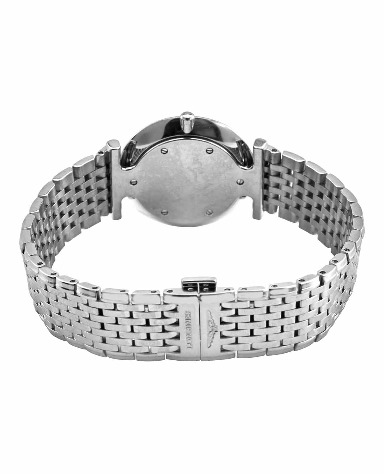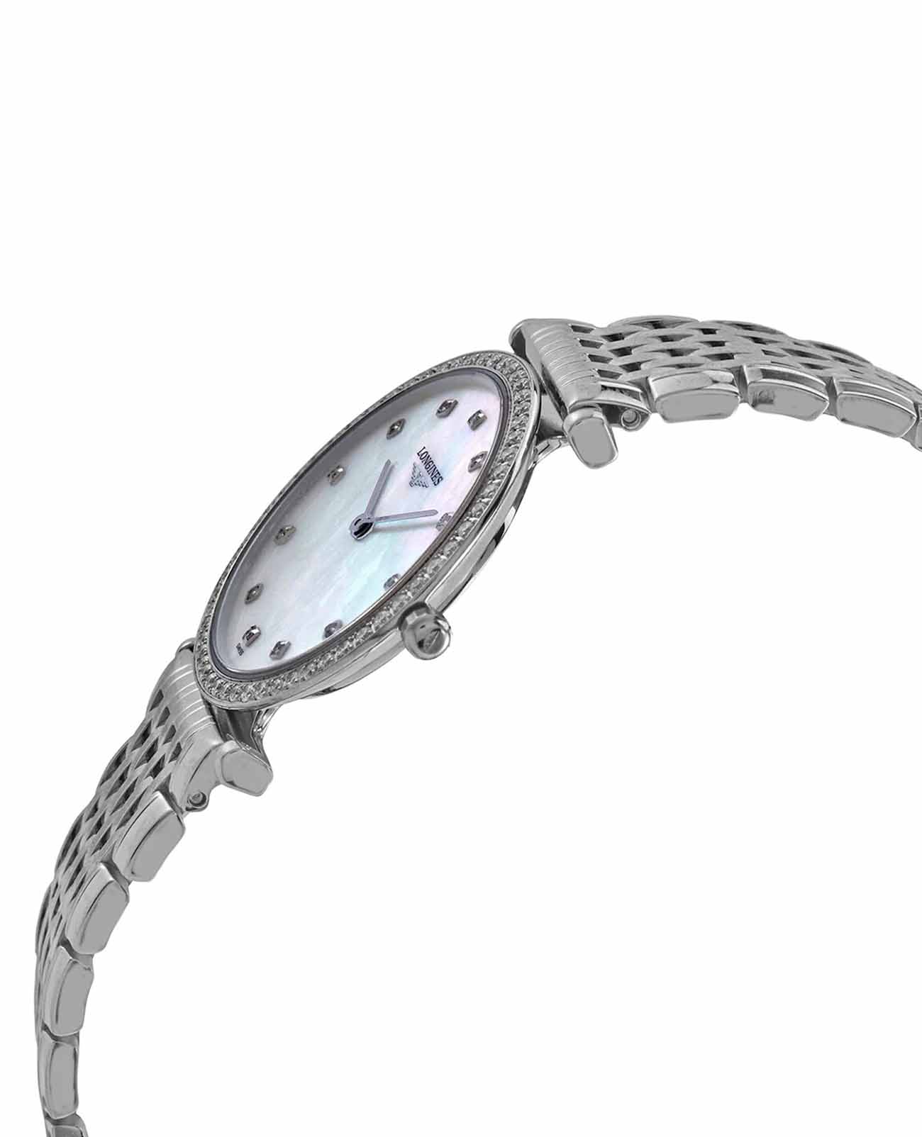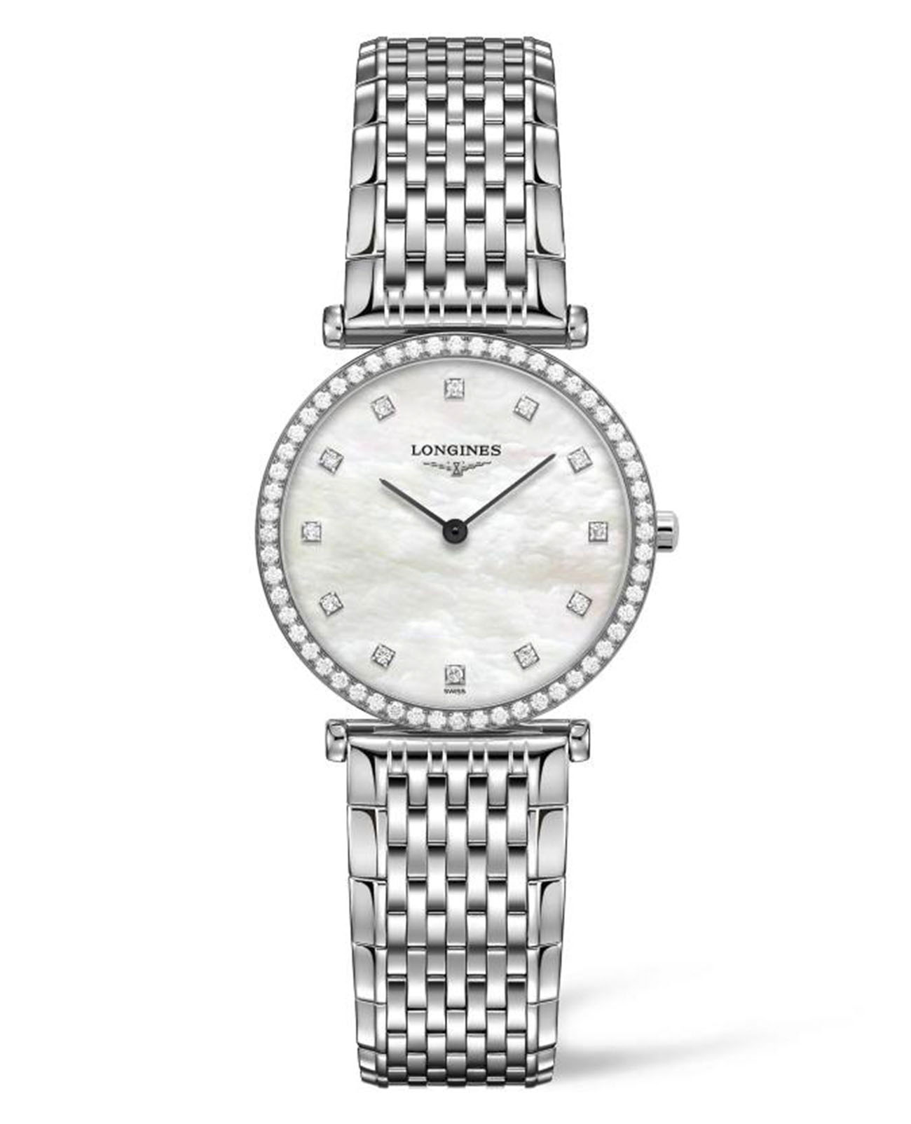 Женские швейцарские часы Longines La Grande Classique L4.513.0.87.6, кварцевый механизм с высокой точностью. Сапфировое стеклоСапфировое стеклоПрочный и надёжный материал из кристалла сапфира синтетического происхождения, характеризующийся особой твёрдостью и устойчивостью к царапинам и повреждениям. устойчивое к появлению царапин, обладающее высокой прозрачностью. Корпус часов изготовлен из стали. БезельБезельВнешний ободок, закрепляющий стекло. В спортивных часах так называется поворотное кольцо с делениями на циферблате, выполняет роль таймера – замеряет отрезки времени на шкале. Неподвижный безель – элемент декора. Однонаправленно вращающийся безель на дайверских часах позволяет фиксировать моменты погружения и выныривания на поверхность. украшен бриллиантами. Циферблат с 12 бриллиантами 0,50 карат. Класс водозащиты: 30 метров, позволит защитить корпус от случайных брызг или капель дождя. Стальной браслет на застёжке-бабочке с кнопкамиЗастёжка "бабочка"Такой вид застёжки дополняется предохранителями, помогающими избежать случайного раскрытия браслета. Обладают изящным исполнением. .