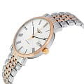 Белый матовый циферблат дополнен контрастными стрелками и римскими цифрами. Корпус выполнен из нержавеющей стали 316L и 18 каратного розового золота18-каратное золотоОбозначение по каратной системе пробирования, оно показывает, сколько драгоценного металла содержится в изделии. 18 карат - в составе 75% чистого золота, соответствует 750 пробе.