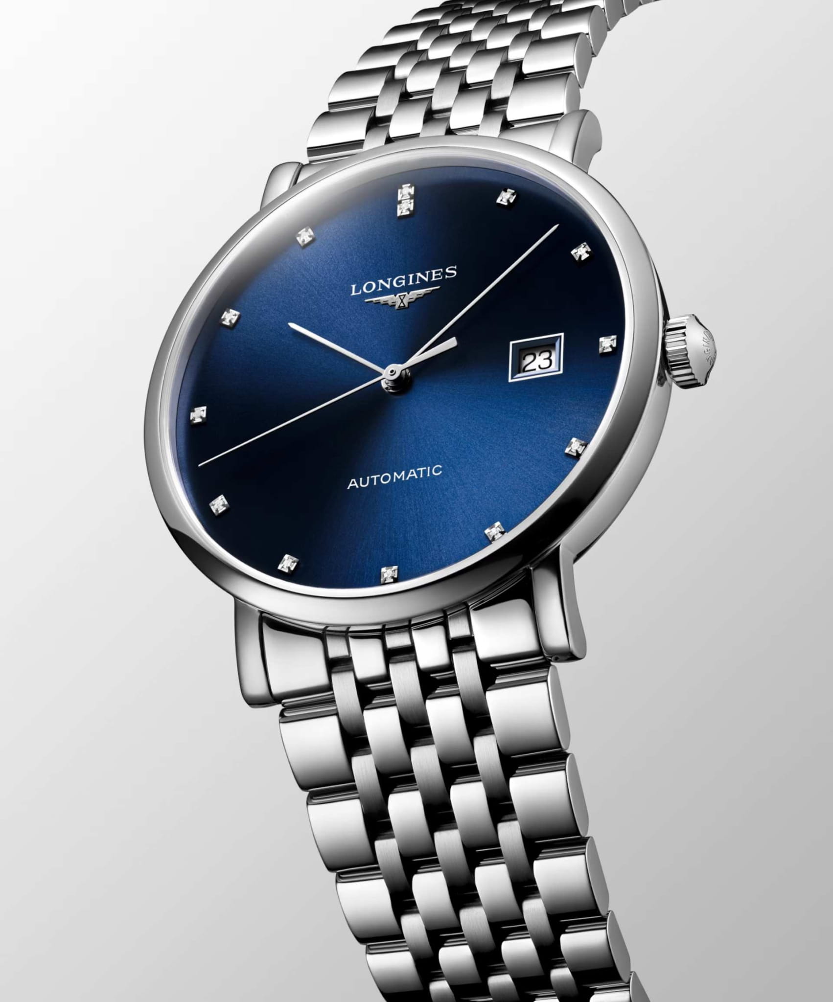 Изысканные мужские часы Longines Elegant Collection L4.910.4.99.6 — это воплощение спокойной роскоши и вечного стиля. Все элементы циферблата подчеркивают элегантность и классический вкус модели. Корпус часов изготовлен из нержавеющей стали, диаметром 39 мм. Защиту циферблата обеспечивает прочное сапфировое стеклоСапфировое стеклоПрочный и надёжный материал из кристалла сапфира синтетического происхождения, характеризующийся особой твёрдостью и устойчивостью к царапинам и повреждениям. с антибликовым покрытиемАнтибликовое покрытиеСлой оксида металла в 0,13-0,3 микрон, благодаря которому стекло часов не бликует и не отражает свет. Антибликовое покрытие уменьшает отражение света в 10 раз, обеспечивая отличную читаемость показателей циферблата. гарантирующее четкость показаний. Циферблат украшен 13 бриллиантами Top Wesselton VS-SI общим весом 0,032 карата. Автоматический механизм L888 обеспечивает высокую точность и простоту использования. Водостойкость до 30 метров позволит плавать, нырять и заниматься другими водными видами спорта. Изысканный браслет выполнен из нержавеющей стали на застёжке-бабочке с кнопкамиЗастёжка "бабочка"Такой вид застёжки дополняется предохранителями, помогающими избежать случайного раскрытия браслета. Обладают изящным исполнением. , обеспечивающей комфортное ношение и надёжную фиксацию на запястье. Окошко даты в положении 3 часа. Коллекция The Elegant Collection сочетает в себе классическую элегантность и современный подход к дизайну, делая эти часы универсальным аксессуаром — как для торжественных случаев, так и для повседневной жизни.