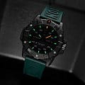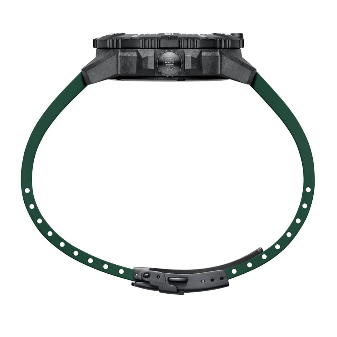 Luminox XS.3877 — это эксклюзивные швейцарские часы, которые представляют собой идеальное сочетание надежности и функциональности. Эти часы оснащены механизмом с автоподзаводом на базе калибра Sellita SW 220-1, содержащим 24 камня, что обеспечивает их точность и долговечность. Корпус изготовлен из прочного материала CARBONOX, который усилен прессованным карбоном, что придаёт часам легкость и устойчивость к внешним воздействиям. Черный циферблат украшен метками в виде штрихов и защищен сапфировым стекломСапфировое стеклоПрочный и надёжный материал из кристалла сапфира синтетического происхождения, характеризующийся особой твёрдостью и устойчивостью к царапинам и повреждениям. с антибликовым покрытиемАнтибликовое покрытиеСлой оксида металла в 0,13-0,3 микрон, благодаря которому стекло часов не бликует и не отражает свет. Антибликовое покрытие уменьшает отражение света в 10 раз, обеспечивая отличную читаемость показателей циферблата., что гарантирует отличную читаемость в любых условиях. Особая технология LLTLLTLLT — это автономный механизм подсветки, основанный на использовании микроскопических газонаполненных элементов. Специальные герметичные капсулы из боросиликатного стекла, интегрированные в циферблат, генерируют свечение без необходимости подключения к внешним источникам энергии. Для их работы не требуется ни дополнительный свет, ни механическое воздействие (например, нажатие кнопки). Свечение возникает благодаря химическому процессу: реакция между тритием, заключенным в капсулах, и люминофорным покрытием создает стабильное автономное освещение. Технология обеспечивает энергетическую независимость и долговечность подсветки.-подсветки позволяет без труда определять время в условиях полной темноты и будет сохранять свою функциональность на протяжении 25 лет. На циферблате расположены окошки даты и дня недели в положении 3 часа, что добавляет удобства в использовании. БезельБезельВнешний ободок, закрепляющий стекло. В спортивных часах так называется поворотное кольцо с делениями на циферблате, выполняет роль таймера – замеряет отрезки времени на шкале. Неподвижный безель – элемент декора. Однонаправленно вращающийся безель на дайверских часах позволяет фиксировать моменты погружения и выныривания на поверхность. часов вращается в одном направлении и оснащен светящейся меткой на 12 часов для дополнительной функциональности. Завинчивающаяся заводная головка с защитой и двойной уплотнительной прокладкой обеспечивает надежную герметичность, а задняя крышка из стали 316L, выполненная с прозрачным дизайном, позволяет увидеть внутренний механизм часов. Часы обладают впечатляющей водозащитой до 200 метров, что делает их отличным выбором для водных приключений. Каучуковый зеленый ремешок с раскладной застёжкойРаскладная застёжкаТакой тип застёжки используется только на браслетах из металла. Она никогда не раскрывается полностью, происходит разделение на 2 и более частей. Раскладывающая застёжка снизит вероятность потери часов к минимуму. и системой блокировки обеспечивает комфортное ношение и надежность. Также предусмотрена система быстрой замены ремешка, что позволяет легко адаптировать часы под ваш стиль.