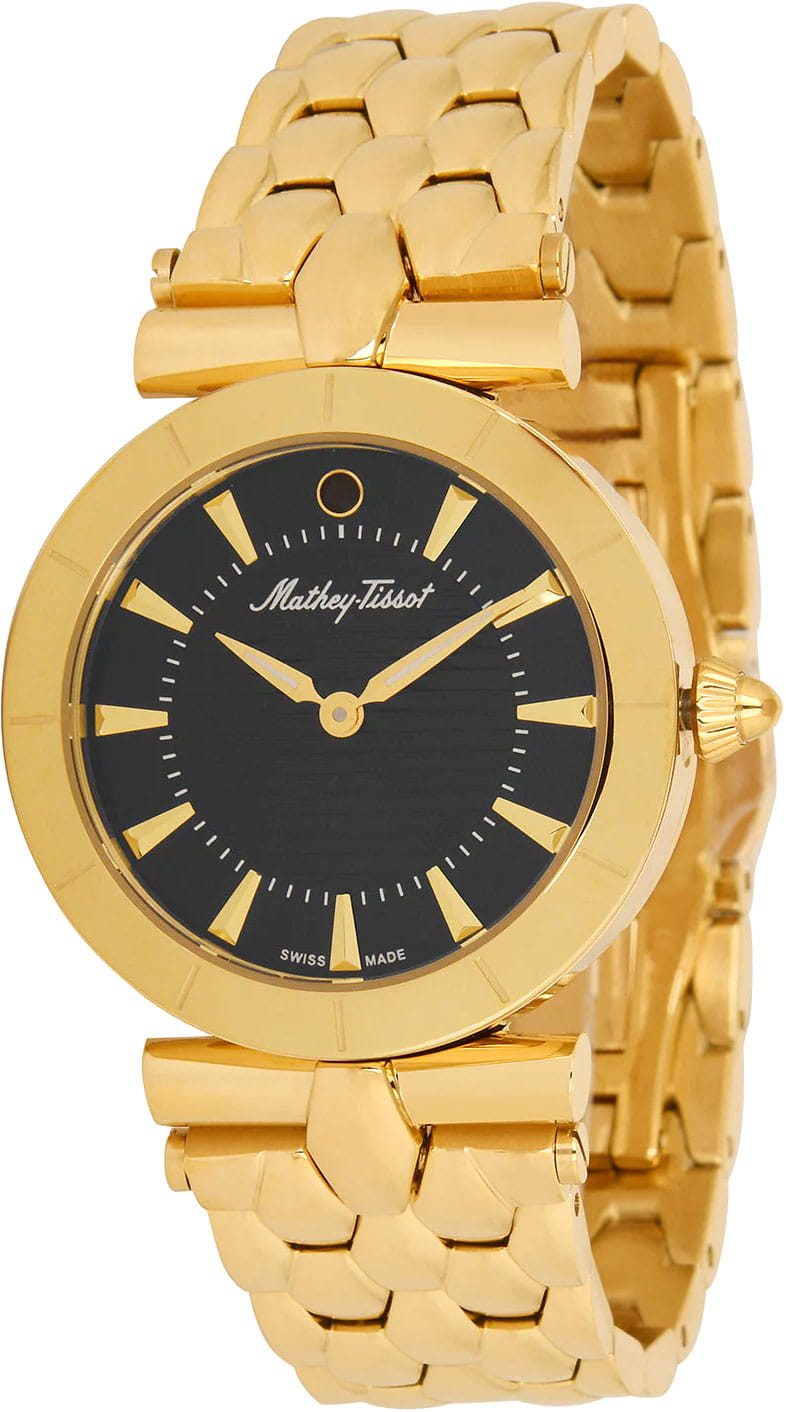 Женские кварцевые часы Mathey-Tissot Tarta D106PN — это стильное сочетание элегантности и современного дизайна. Изящный корпус выполнен из нержавеющей стали с PVD-покрытиемPVDУльтратонкое покрытие наносится в технике вакуумного напыления, сочетает в себе нитрид титана особой прочности со слоем золота или оксида хрома. Несёт в себе декоративную или защитную функцию. золотистого цвета, диаметром 34 мм и толщиной 8 мм, что придаст образу женственности и романтизма. Изысканный циферблат с метками в виде штрихов придает модели особый блеск. Циферблат защищен минеральным стекломМинеральное стеклоМинеральное стекло представляет собой искусственно выращенный минерал кварца. Такое стекло отличается особой устойчивостью к повреждениям и царапинам. Уступает по некоторым качествам сапфировому стеклу., обеспечивающий устойчивость к царапинам. Стрелки с люминесцентным покрытиемЛюминесцентное покрытиеПозволяет считывать показания времени в темноте. Производители наносят на стрелки, часовые индексы, безель или поверхность циферблата светонакопительный состав, дающий холодное свечение.. Часы оснащены надежным кварцевым механизмом. Стальной браслет с PVD-покрытиемPVDУльтратонкое покрытие наносится в технике вакуумного напыления, сочетает в себе нитрид титана особой прочности со слоем золота или оксида хрома. Несёт в себе декоративную или защитную функцию. на застёжке-бабочке с кнопкамиЗастёжка "бабочка"Такой вид застёжки дополняется предохранителями, помогающими избежать случайного раскрытия браслета. Обладают изящным исполнением. , гарантирует комфортное и безопасное ношение. Класс водозащиты: 50 метров позволит защитить корпус от случайных брызг или капель дождя. Mathey-Tissot  — отличный выбор для тех, кто ценит утонченность и качество.