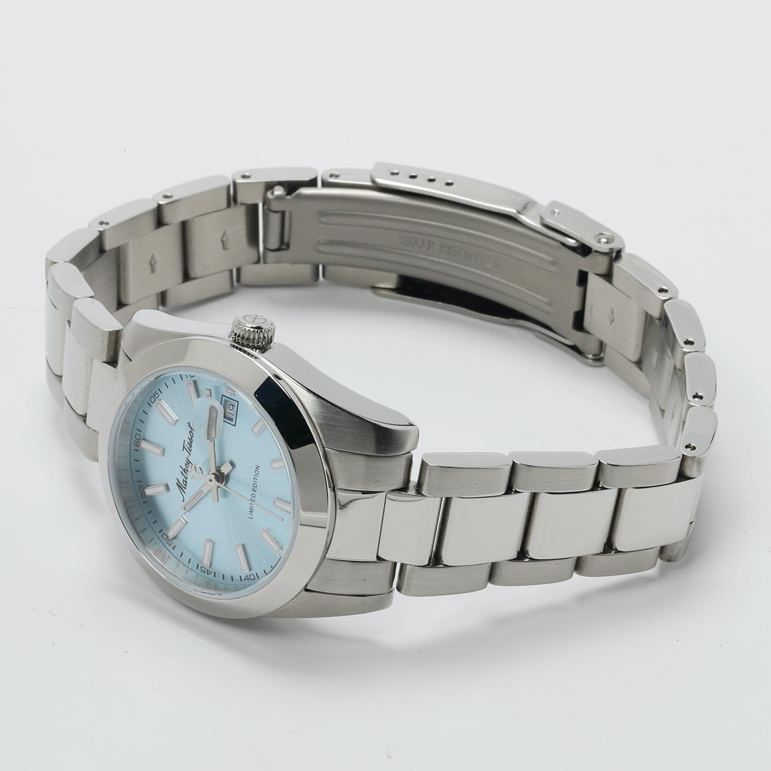 Женские кварцевые часы Mathey-Tissot Mathy D451BU — это стильное сочетание элегантности и современного дизайна. Лимитированная серия. Изящный корпус выполнен из нержавеющей стали, диаметром 32 мм, что придаст образу женственности и романтизма. Изысканный циферблат с метками в виде штрихов придает модели особый блеск. Циферблат защищен минеральным стекломМинеральное стеклоМинеральное стекло представляет собой искусственно выращенный минерал кварца. Такое стекло отличается особой устойчивостью к повреждениям и царапинам. Уступает по некоторым качествам сапфировому стеклу., обеспечивающий устойчивость к царапинам. Стрелки и метки с люминесцентным покрытиемЛюминесцентное покрытиеПозволяет считывать показания времени в темноте. Производители наносят на стрелки, часовые индексы, безель или поверхность циферблата светонакопительный состав, дающий холодное свечение.. Окошко даты находится в положении 3 часа. Часы оснащены надежным кварцевым механизмом. Стальной браслет на раскладной застёжке с фиксаторомРаскладная застёжкаТакой тип застёжки используется только на браслетах из металла. Она никогда не раскрывается полностью, происходит разделение на 2 и более частей. Раскладывающая застёжка снизит вероятность потери часов к минимуму., гарантирует комфортное и безопасное ношение. Класс водозащиты: 50 метров позволит защитить корпус от случайных брызг или капель дождя. Mathey-Tissot — отличный выбор для тех, кто ценит утонченность и качество.