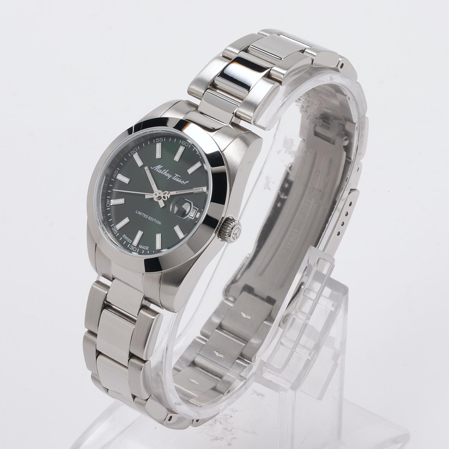 Женские кварцевые часы Mathey-Tissot Mathy D451VE — это стильное сочетание элегантности и современного дизайна. Лимитированная серия. Изящный корпус выполнен из нержавеющей стали, диаметром 32 мм, что придаст образу женственности и романтизма. Изысканный циферблат с метками в виде штрихов придает модели особый блеск. Циферблат защищен минеральным стекломМинеральное стеклоМинеральное стекло представляет собой искусственно выращенный минерал кварца. Такое стекло отличается особой устойчивостью к повреждениям и царапинам. Уступает по некоторым качествам сапфировому стеклу., обеспечивающий устойчивость к царапинам. Стрелки и метки с люминесцентным покрытиемЛюминесцентное покрытиеПозволяет считывать показания времени в темноте. Производители наносят на стрелки, часовые индексы, безель или поверхность циферблата светонакопительный состав, дающий холодное свечение.. Окошко даты находится в положении 3 часа. Часы оснащены надежным кварцевым механизмом. Стальной браслет на раскладной застёжке с фиксаторомРаскладная застёжкаТакой тип застёжки используется только на браслетах из металла. Она никогда не раскрывается полностью, происходит разделение на 2 и более частей. Раскладывающая застёжка снизит вероятность потери часов к минимуму., гарантирует комфортное и безопасное ношение. Класс водозащиты: 50 метров позволит защитить корпус от случайных брызг или капель дождя. Mathey-Tissot  — отличный выбор для тех, кто ценит утонченность и качество.
