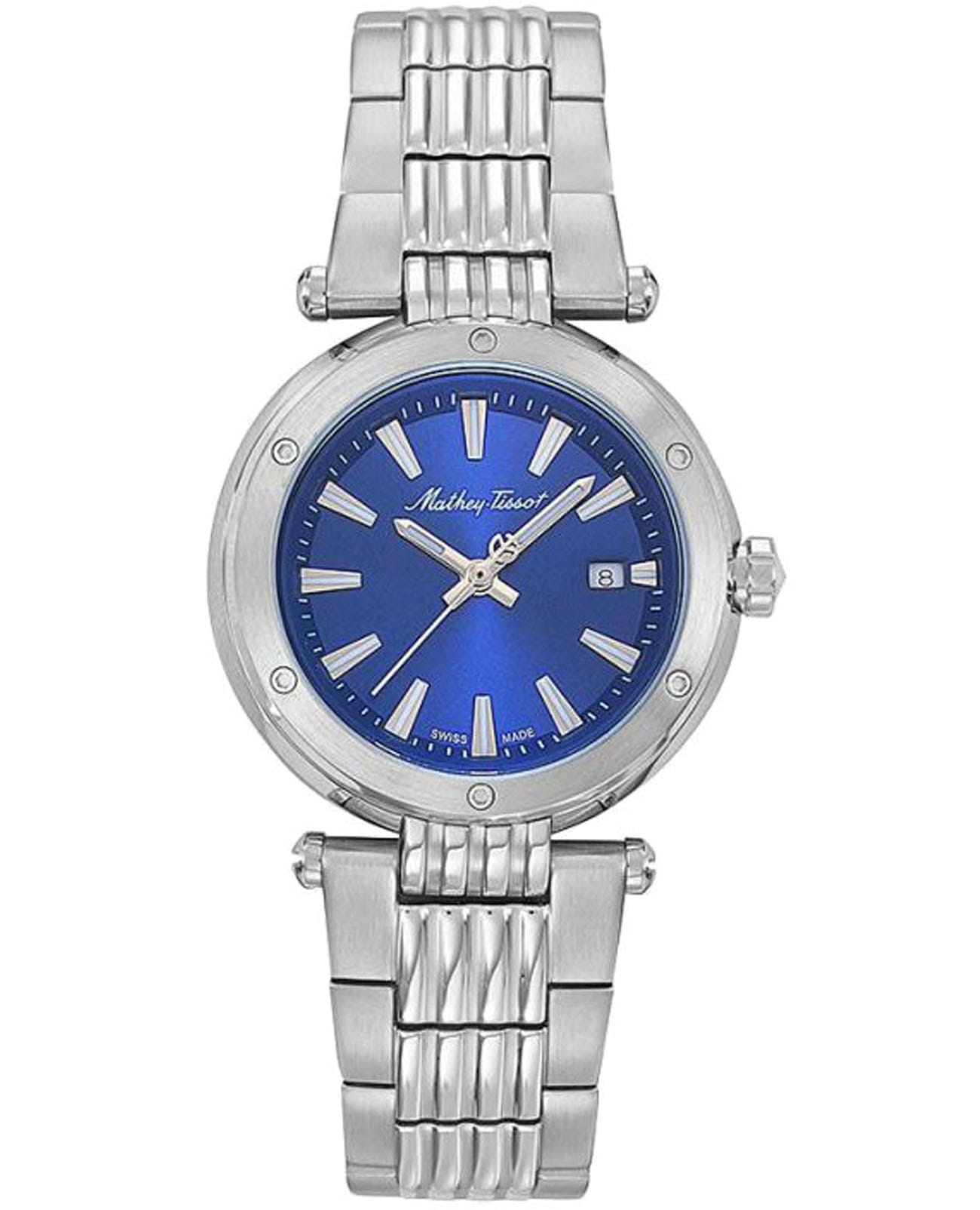 Женские кварцевые часы Mathey-Tissot Neptune D912ABU — это стильное сочетание элегантности и современного дизайна. Изящный корпус выполнен из нержавеющей стали, диаметром 32 мм, что придаст образу женственности и романтизма. Изысканный циферблат с метками в виде штрихов придает модели особый блеск. Циферблат защищен минеральным стекломМинеральное стеклоМинеральное стекло представляет собой искусственно выращенный минерал кварца. Такое стекло отличается особой устойчивостью к повреждениям и царапинам. Уступает по некоторым качествам сапфировому стеклу. с сапфировым покрытием, обеспечивает устойчивость к царапинам. Стрелки и метки с люминесцентным покрытиемЛюминесцентное покрытиеПозволяет считывать показания времени в темноте. Производители наносят на стрелки, часовые индексы, безель или поверхность циферблата светонакопительный состав, дающий холодное свечение.. БезельБезельВнешний ободок, закрепляющий стекло. В спортивных часах так называется поворотное кольцо с делениями на циферблате, выполняет роль таймера – замеряет отрезки времени на шкале. Неподвижный безель – элемент декора. Однонаправленно вращающийся безель на дайверских часах позволяет фиксировать моменты погружения и выныривания на поверхность. украшен винтами. Окошко даты находится в положении 3 часа. Часы оснащены надежным кварцевым механизмом. Стальной браслет на застёжке-бабочке с кнопкамиЗастёжка "бабочка"Такой вид застёжки дополняется предохранителями, помогающими избежать случайного раскрытия браслета. Обладают изящным исполнением. , гарантирует комфортное и безопасное ношение. Класс водозащиты: 50 метров позволит защитить корпус от случайных брызг или капель дождя. Mathey-Tissot  — отличный выбор для тех, кто ценит утонченность и качество.