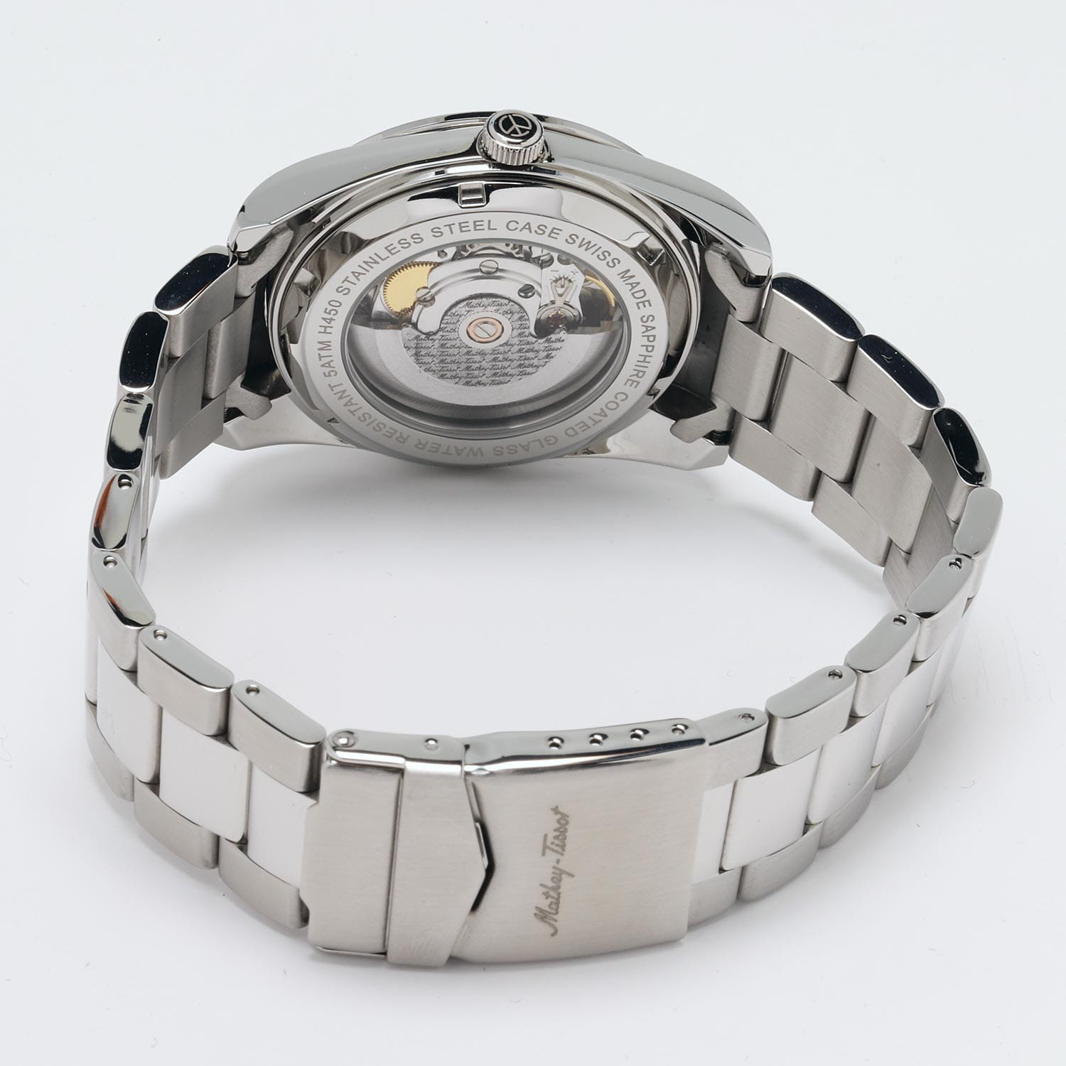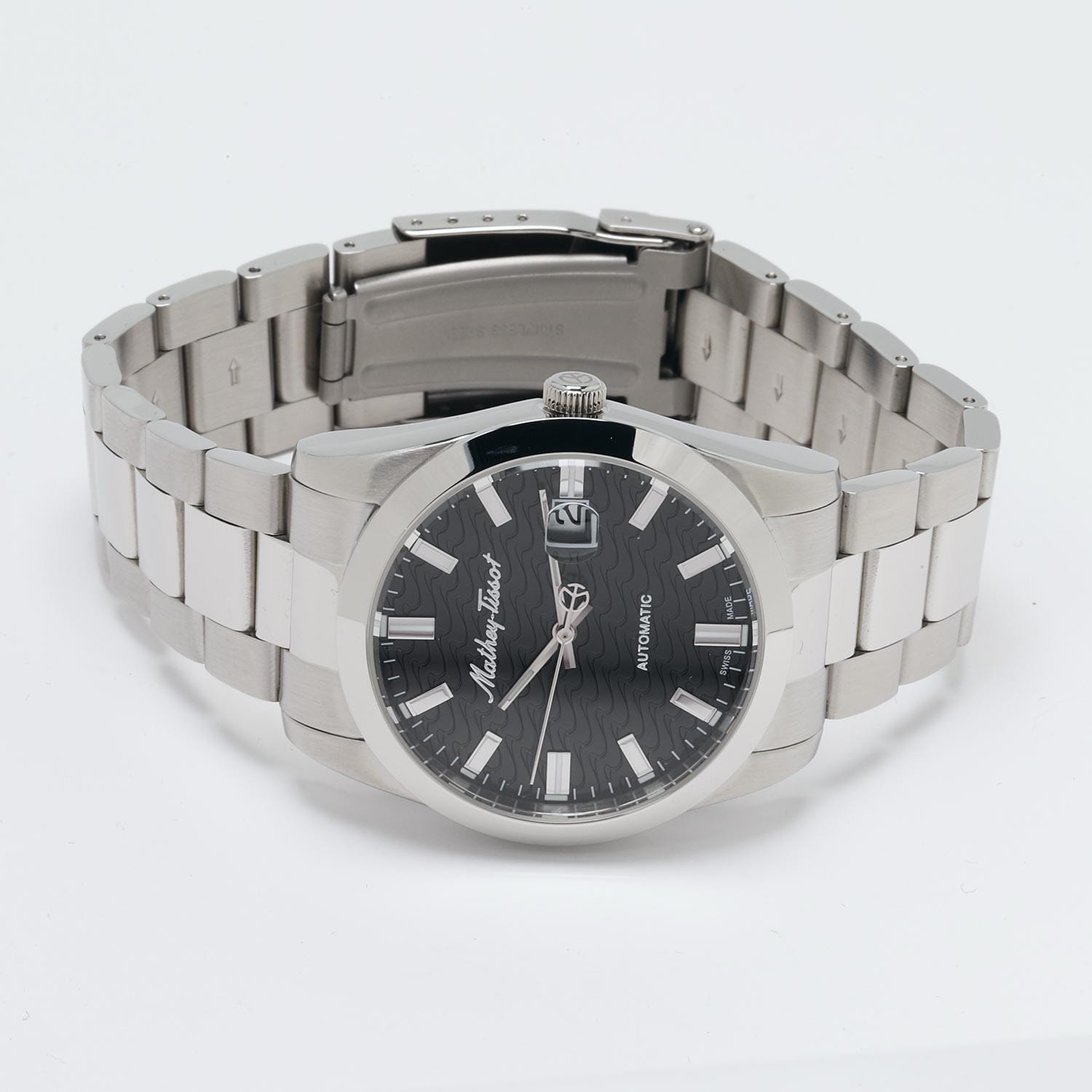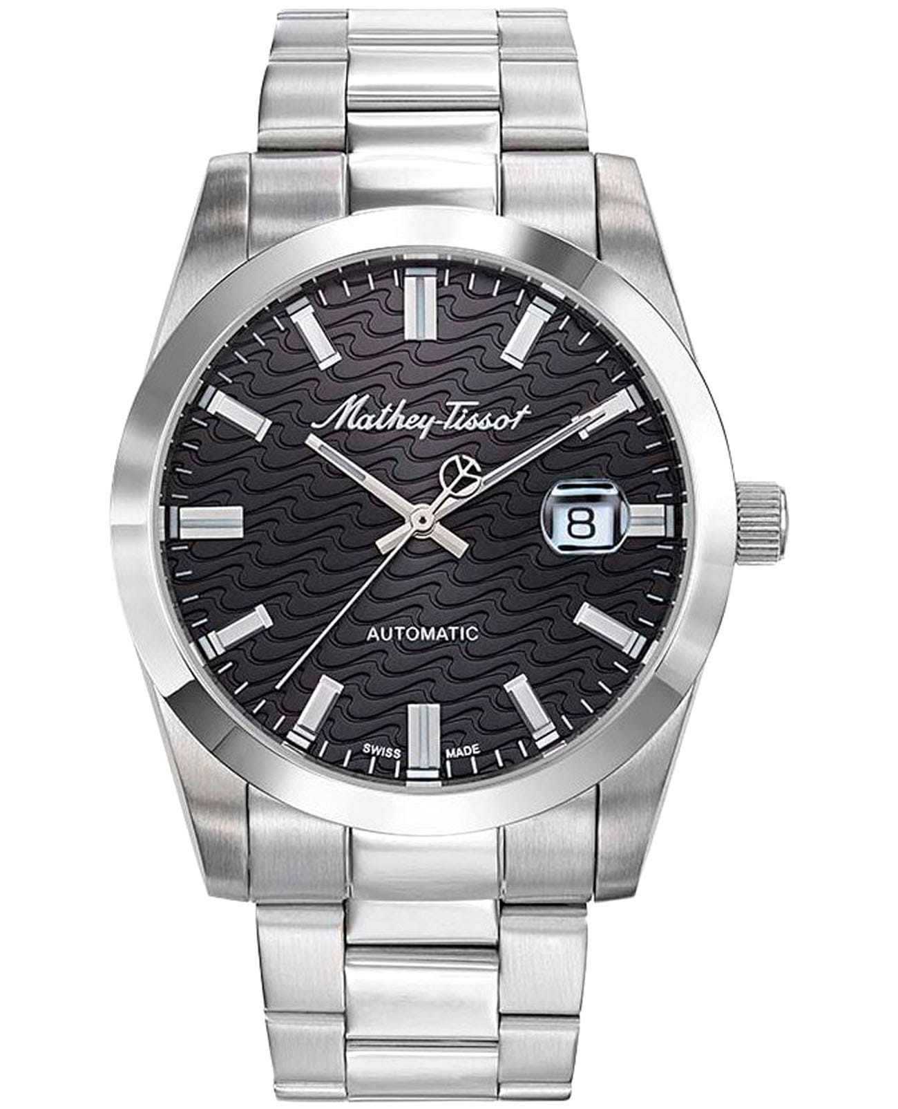 Мужские механические часы с автоподзаводом Mathey-Tissot Mathy H1450ATAN — это стильное сочетание элегантности и современного дизайна. Изящный корпус выполнен из нержавеющей стали, диаметром 42 мм, что придаст образу элегантности и надежности. Изысканный циферблат с метками в виде штрихов придает модели особый блеск. Циферблат защищен минеральным стекломМинеральное стеклоМинеральное стекло представляет собой искусственно выращенный минерал кварца. Такое стекло отличается особой устойчивостью к повреждениям и царапинам. Уступает по некоторым качествам сапфировому стеклу. с сапфировым покрытием, обеспечивает устойчивость к царапинам. Стрелки и метки с люминесцентным покрытиемЛюминесцентное покрытиеПозволяет считывать показания времени в темноте. Производители наносят на стрелки, часовые индексы, безель или поверхность циферблата светонакопительный состав, дающий холодное свечение.. Окошко даты находится в положении 3 часа. Стальной браслет на раскладной застёжке с фиксаторомРаскладная застёжкаТакой тип застёжки используется только на браслетах из металла. Она никогда не раскрывается полностью, происходит разделение на 2 и более частей. Раскладывающая застёжка снизит вероятность потери часов к минимуму., гарантирует комфортное и безопасное ношение. Рифленая заводная головка. Класс водозащиты: 50 метров позволит защитить корпус от случайных брызг или капель дождя. Mathey-Tissot  — отличный выбор для тех, кто ценит утонченность и качество.