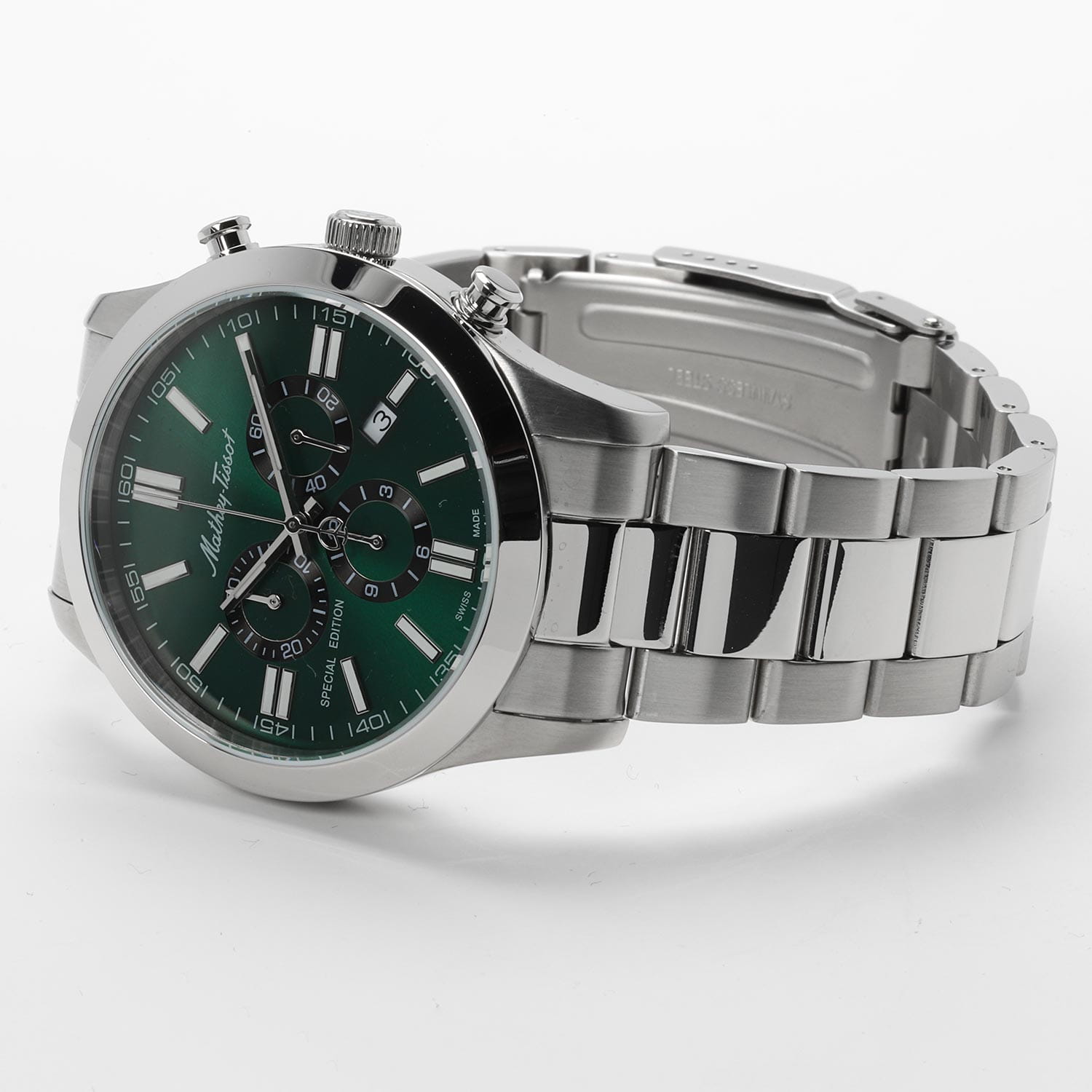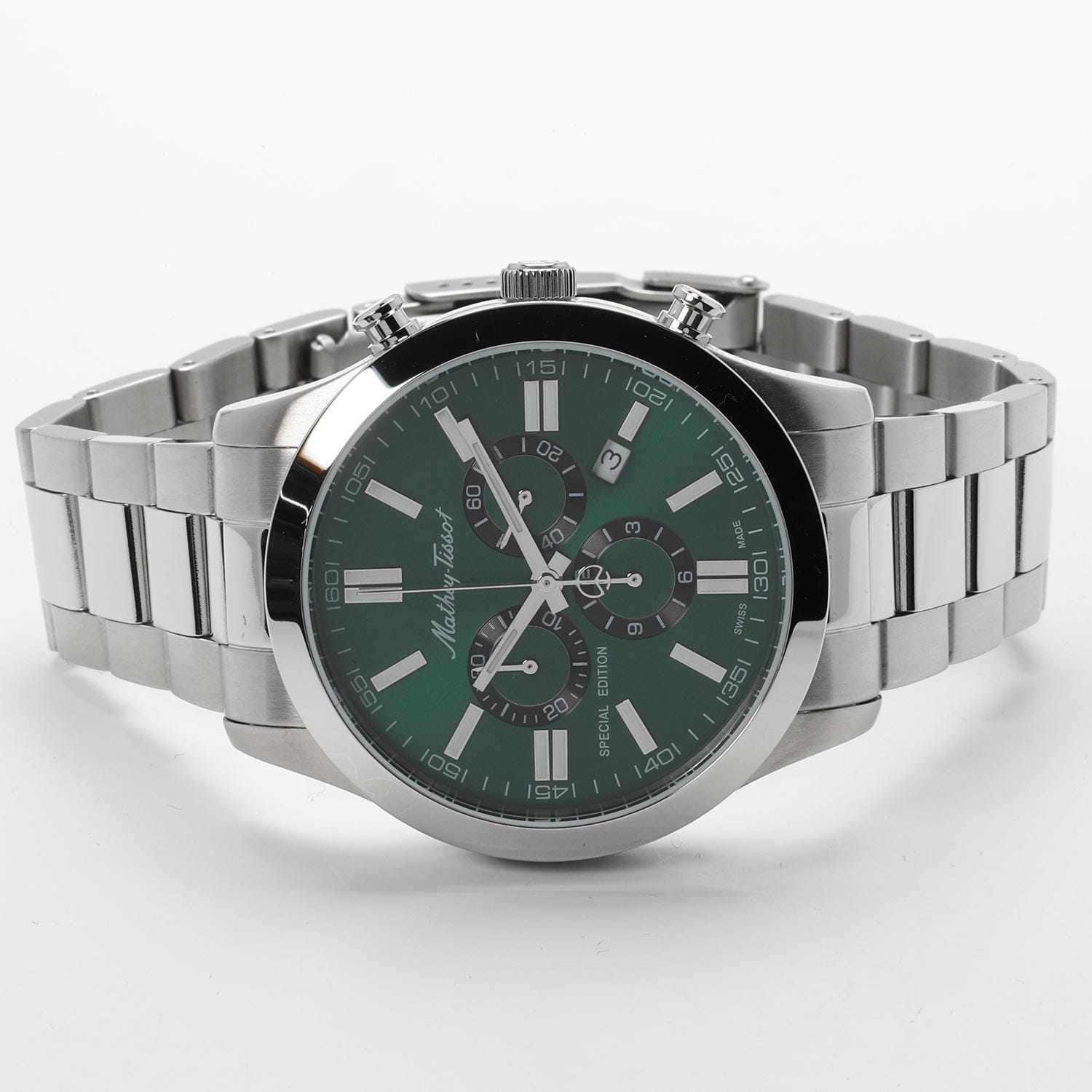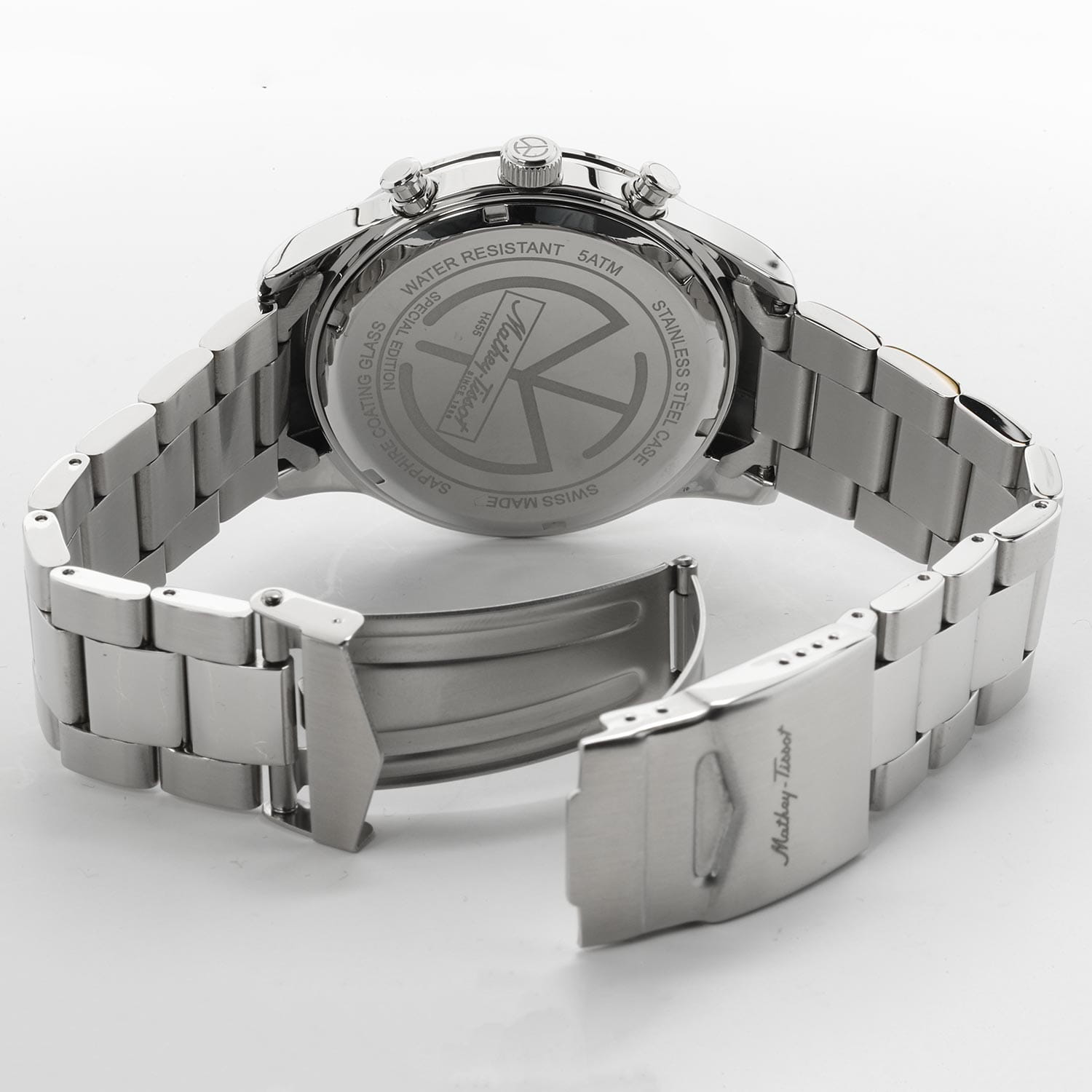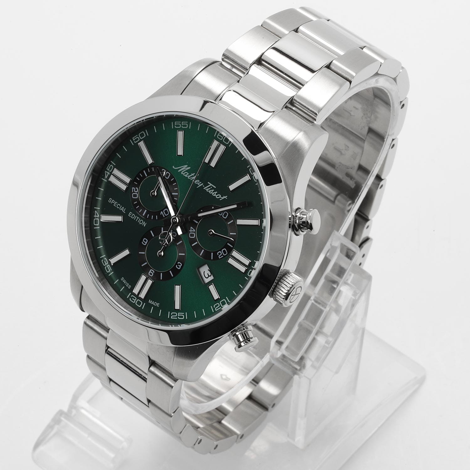 Мужские кварцевые часы-хронографХронографФункция позволяет измерять отрезки времени с особой точностью: часы, минуты, секунды. Верным признаком хронографа является наличие на циферблате 3 дополнительных окошек-счётчиков. с секундомеромСекундомерСекундоме́р — прибор, способный измерять интервалы времени с точностью до долей секунды. Mathey-Tissot Mathy H455CHVE — это стильное сочетание элегантности и современного дизайна. Изящный корпус выполнен из нержавеющей стали, диаметром 44 мм, что придаст образу элегантности и надежности. Изысканный циферблат с метками в виде штрихов придает модели особый блеск. Циферблат защищен минеральным стекломМинеральное стеклоМинеральное стекло представляет собой искусственно выращенный минерал кварца. Такое стекло отличается особой устойчивостью к повреждениям и царапинам. Уступает по некоторым качествам сапфировому стеклу. с сапфировым покрытием, обеспечивает устойчивость к царапинам. Стрелки и метки с люминесцентным покрытиемЛюминесцентное покрытиеПозволяет считывать показания времени в темноте. Производители наносят на стрелки, часовые индексы, безель или поверхность циферблата светонакопительный состав, дающий холодное свечение.. Окошко даты находится в положении 4 часа. Стальной браслет на раскладной застёжке с фиксаторомРаскладная застёжкаТакой тип застёжки используется только на браслетах из металла. Она никогда не раскрывается полностью, происходит разделение на 2 и более частей. Раскладывающая застёжка снизит вероятность потери часов к минимуму., гарантирует комфортное и безопасное ношение. Рифленая заводная головка. Класс водозащиты: 50 метров позволит защитить корпус от случайных брызг или капель дождя. Mathey-Tissot — отличный выбор для тех, кто ценит утонченность и качество.