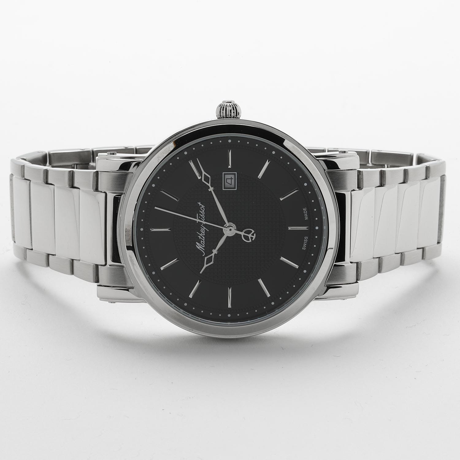 Мужские кварцевые часы Mathey-Tissot City Metal HB611251MAN — это стильное сочетание элегантности и современного дизайна. Изящный корпус выполнен из нержавеющей стали 316L серебристого цвета, диаметром 42 мм, что придаст образу элегантности и надежности. Изысканный циферблат с метками в виде штрихов придает модели особый блеск. Циферблат защищен минеральным стекломМинеральное стеклоМинеральное стекло представляет собой искусственно выращенный минерал кварца. Такое стекло отличается особой устойчивостью к повреждениям и царапинам. Уступает по некоторым качествам сапфировому стеклу. с сапфировым покрытием, обеспечивающий устойчивость к царапинам. Окошко даты находится в положении 3 часа. Часы оснащены надежным кварцевым механизмом. Стальной браслет на раскладной застёжкеРаскладная застёжкаТакой тип застёжки используется только на браслетах из металла. Она никогда не раскрывается полностью, происходит разделение на 2 и более частей. Раскладывающая застёжка снизит вероятность потери часов к минимуму., гарантирует комфортное и безопасное ношение. Класс водозащиты: 30 метров позволит защитить корпус от случайных брызг или капель дождя. Mathey-Tissot  — отличный выбор для тех, кто ценит утонченность и качество.