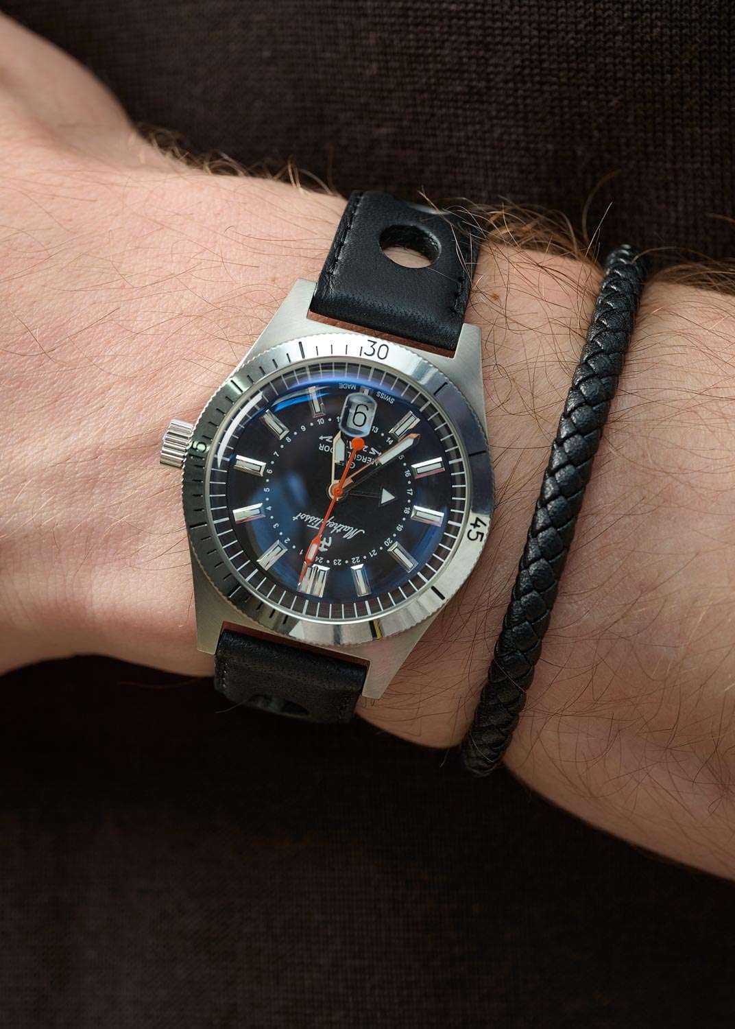 Мужские кварцевые часы Mathey-Tissot Mergulhador GMTGMTОтображение времени второго часового пояса.Такая функция особенно актуальна для путешественников и бизнесменов,которые общаются с людьми из разных стран,теперь вы всегда будете знать,какой час у вашего партнёра или близкого человека. MRGAN — это стильное сочетание элегантности и современного дизайна. Изящный корпус выполнен из нержавеющей стали, диаметром 41 мм, что придаст образу элегантности и надежности. Циферблат с метками в виде штрихов придает модели особый блеск. Циферблат защищен минеральным стекломМинеральное стеклоМинеральное стекло представляет собой искусственно выращенный минерал кварца. Такое стекло отличается особой устойчивостью к повреждениям и царапинам. Уступает по некоторым качествам сапфировому стеклу. с сапфировым покрытием, обеспечивает устойчивость к царапинам. Второй часовой поясВторой часовой поясФункция, позволяющая отображать время двух часовых поясов одновременно. в 24-х часовом формате времени отображается центральной стрелкой. Стрелки и метки с люминесцентным покрытиемЛюминесцентное покрытиеПозволяет считывать показания времени в темноте. Производители наносят на стрелки, часовые индексы, безель или поверхность циферблата светонакопительный состав, дающий холодное свечение. SuperLumiNova, которое светится в темноте после непродолжительной зарядки на свету. Окошко даты находится в положении 6 часов. Рифленый безельБезельВнешний ободок, закрепляющий стекло. В спортивных часах так называется поворотное кольцо с делениями на циферблате, выполняет роль таймера – замеряет отрезки времени на шкале. Неподвижный безель – элемент декора. Однонаправленно вращающийся безель на дайверских часах позволяет фиксировать моменты погружения и выныривания на поверхность. с минутными отметками вращается в одном направлении. Часы оснащены надежным кварцевым механизмом. Кожаный ремешок на стандартной застёжке гарантирует комфортное и безопасное ношение. Класс водозащиты: 200 метров позволит плавать, нырять и заниматься другими водными видами спорта. Mathey-Tissot — отличный выбор для тех, кто ценит утонченность и качество.