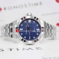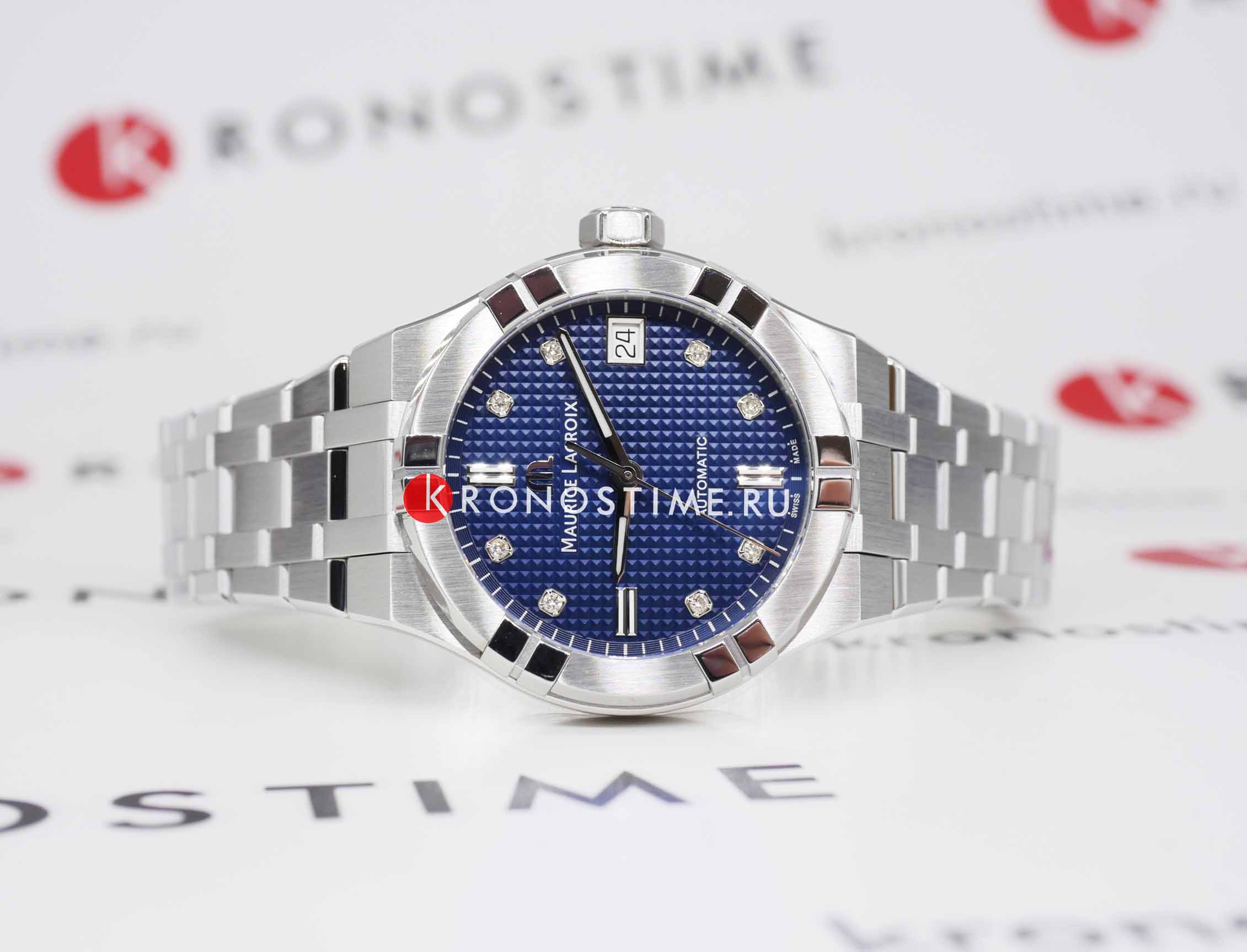 Часы Maurice Lacroix AIKON Automatic Date 35mm (артикул AI6006-SS002-450-1) — элегантная женская модель, сочетающая современный дизайн и швейцарское качество. Корпус диаметром 35 мм выполнен из нержавеющей стали с водозащитой до 200 метров (20 ATM). Синий циферблат с узором «Clous de Paris» украшен 8 бриллиантами и стрелками с люминесцентным покрытием Super-LumiNovaЛюминесцентное покрытиеПозволяет считывать показания времени в темноте. Производители наносят на стрелки, часовые индексы, безель или поверхность циферблата светонакопительный состав, дающий холодное свечение., защищён сапфировым стекломСапфировое стеклоПрочный и надёжный материал из кристалла сапфира синтетического происхождения, характеризующийся особой твёрдостью и устойчивостью к царапинам и повреждениям. с антибликовым покрытием.