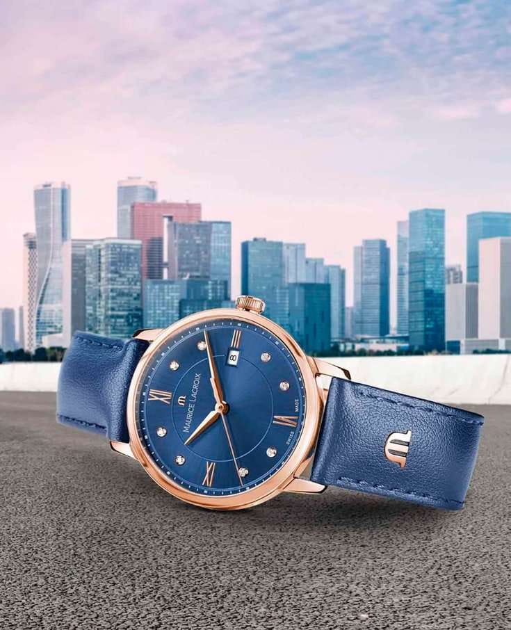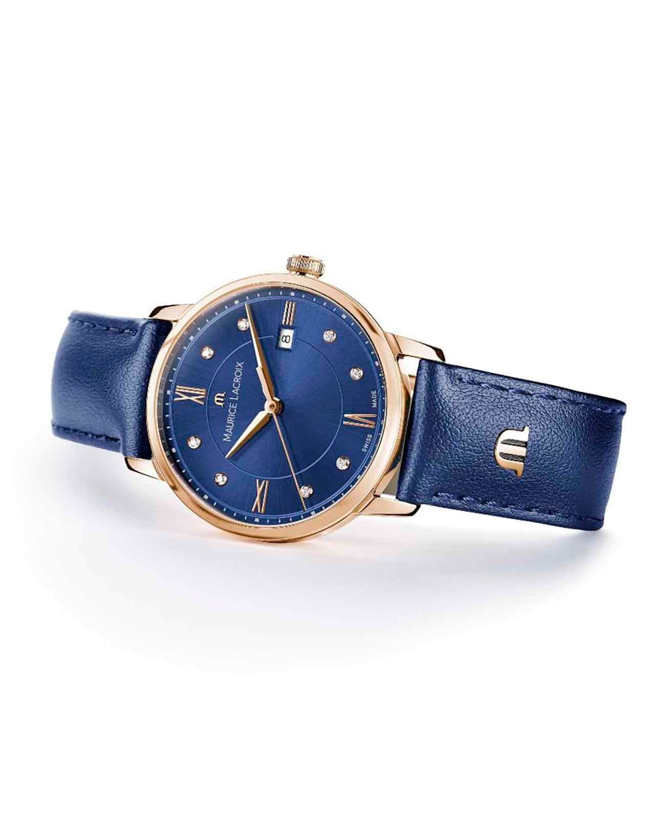 Женские наручные часы Maurice Lacroix Eliros EL1094-PVP01-450-1 из коллекции Eliros Date сочетают в себе элегантный дизайн и надежность швейцарского качества. Модель обладает круглым корпусом диаметром 30 мм, выполненным из нержавеющей стали с PVD-покрытиемPVDУльтратонкое покрытие наносится в технике вакуумного напыления, сочетает в себе нитрид титана особой прочности со слоем золота или оксида хрома. Несёт в себе декоративную или защитную функцию. розового золота, что придает часам роскошный вид. Циферблат синего цвета украшен узором Sunray и оснащен восемью бриллиантами, общим весом 0.04 карата, добавляя модели изысканности и блеска . Для защиты используется сапфировое стеклоСапфировое стеклоПрочный и надёжный материал из кристалла сапфира синтетического происхождения, характеризующийся особой твёрдостью и устойчивостью к царапинам и повреждениям., устойчивое к царапинам и обеспечивающее высокую прозрачность благодаря антибликовому покрытиюАнтибликовое покрытиеСлой оксида металла в 0,13-0,3 микрон, благодаря которому стекло часов не бликует и не отражает свет. Антибликовое покрытие уменьшает отражение света в 10 раз, обеспечивая отличную читаемость показателей циферблата.. Часы оснащены функцией вывода даты, расположенной на позиции «3 часа», что делает их практичными для повседневного использования. Механизм часов представляет собой кварцевый калибр, гарантирующий точность хода и не требующий подзаводки . Ремешок выполнен из натуральной кожи, обеспечивая комфортное ношение и элегантный внешний вид. Модель также оснащена водонепроницаемостью до 50 метров, что позволяет использовать их в повседневной жизни, включая контакт с водой, например, при мытье рук . Эти часы станут идеальным аксессуаром для женщин, ценящих классический стиль и современные технологии.