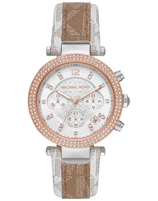 Встречайте этот ослепительный хронограф, усыпанный многочисленными кристаллами. Аксессуар для нежной и уверенной в себе леди. Часы-хронограф с секундомером. Круглый стальной корпус. Циферблат с узнаваемым принтом бренда и метками в виде штрихов. Окошко даты. Стальной безель декорирован паве из кристаллов. Ремешок из экокожи.