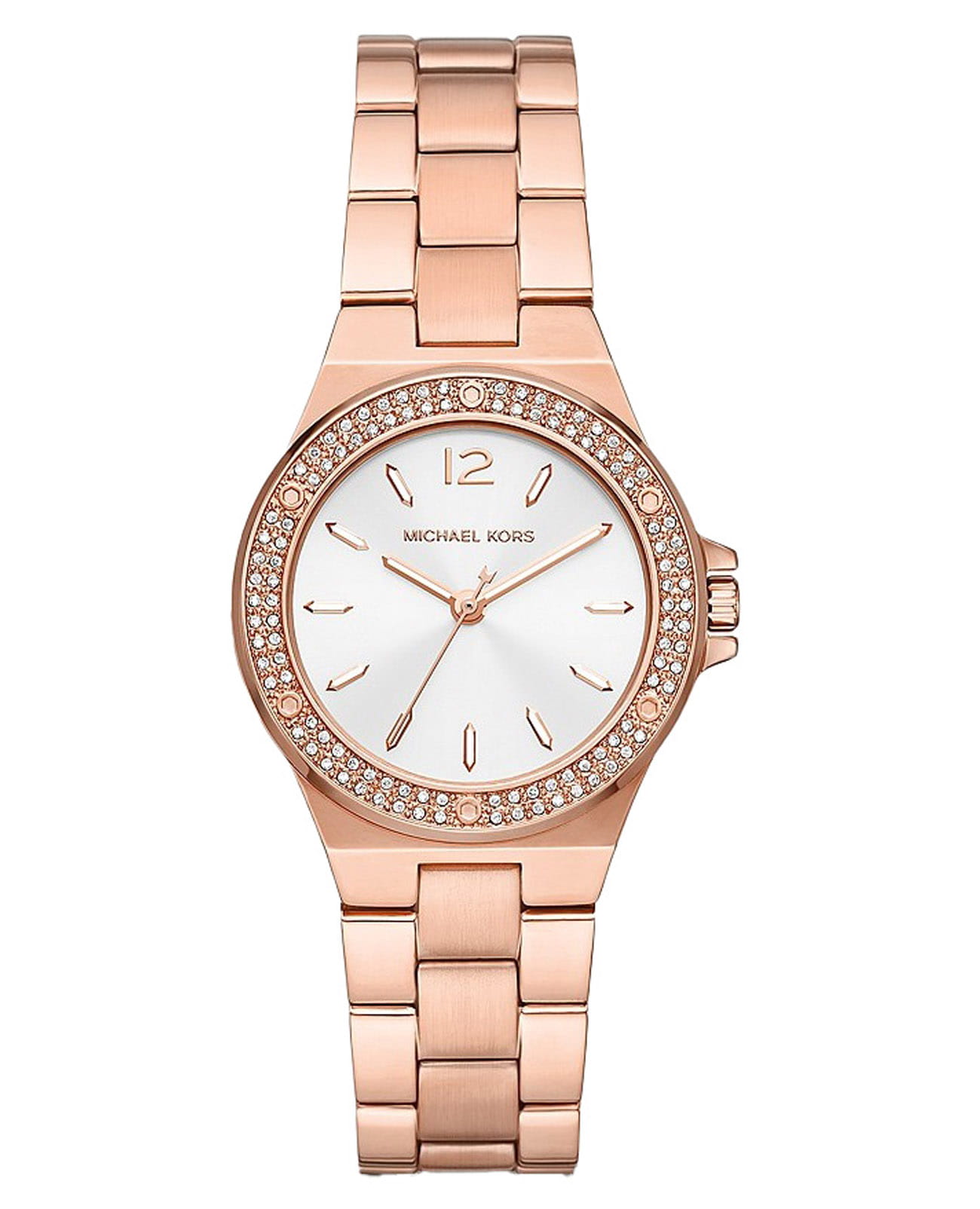 Женские американские часы с минеральным стекломМинеральное стеклоМинеральное стекло представляет собой искусственно выращенный минерал кварца. Такое стекло отличается особой устойчивостью к повреждениям и царапинам. Уступает по некоторым качествам сапфировому стеклу. Michael Kors Lennox MK7279, кварцевый механизм с высокой точностью. Корпус часов изготовлен из нержавеющей стали с PVD-покрытиемPVDУльтратонкое покрытие наносится в технике вакуумного напыления, сочетает в себе нитрид титана особой прочности со слоем золота или оксида хрома. Несёт в себе декоративную или защитную функцию.. БезельБезельВнешний ободок, закрепляющий стекло. В спортивных часах так называется поворотное кольцо с делениями на циферблате, выполняет роль таймера – замеряет отрезки времени на шкале. Неподвижный безель – элемент декора. Однонаправленно вращающийся безель на дайверских часах позволяет фиксировать моменты погружения и выныривания на поверхность. украшен кристаллами. Циферблат выполнен по технологии Sunray (солнечные лучи). Рифленая заводная головка с защитой. Класс водозащиты: 50 метров, позволит защитить корпус от случайных брызг или капель дождя. Стальной браслет с PVD-покрытиемPVDУльтратонкое покрытие наносится в технике вакуумного напыления, сочетает в себе нитрид титана особой прочности со слоем золота или оксида хрома. Несёт в себе декоративную или защитную функцию. на раскладной застёжкеРаскладная застёжкаТакой тип застёжки используется только на браслетах из металла. Она никогда не раскрывается полностью, происходит разделение на 2 и более частей. Раскладывающая застёжка снизит вероятность потери часов к минимуму..