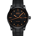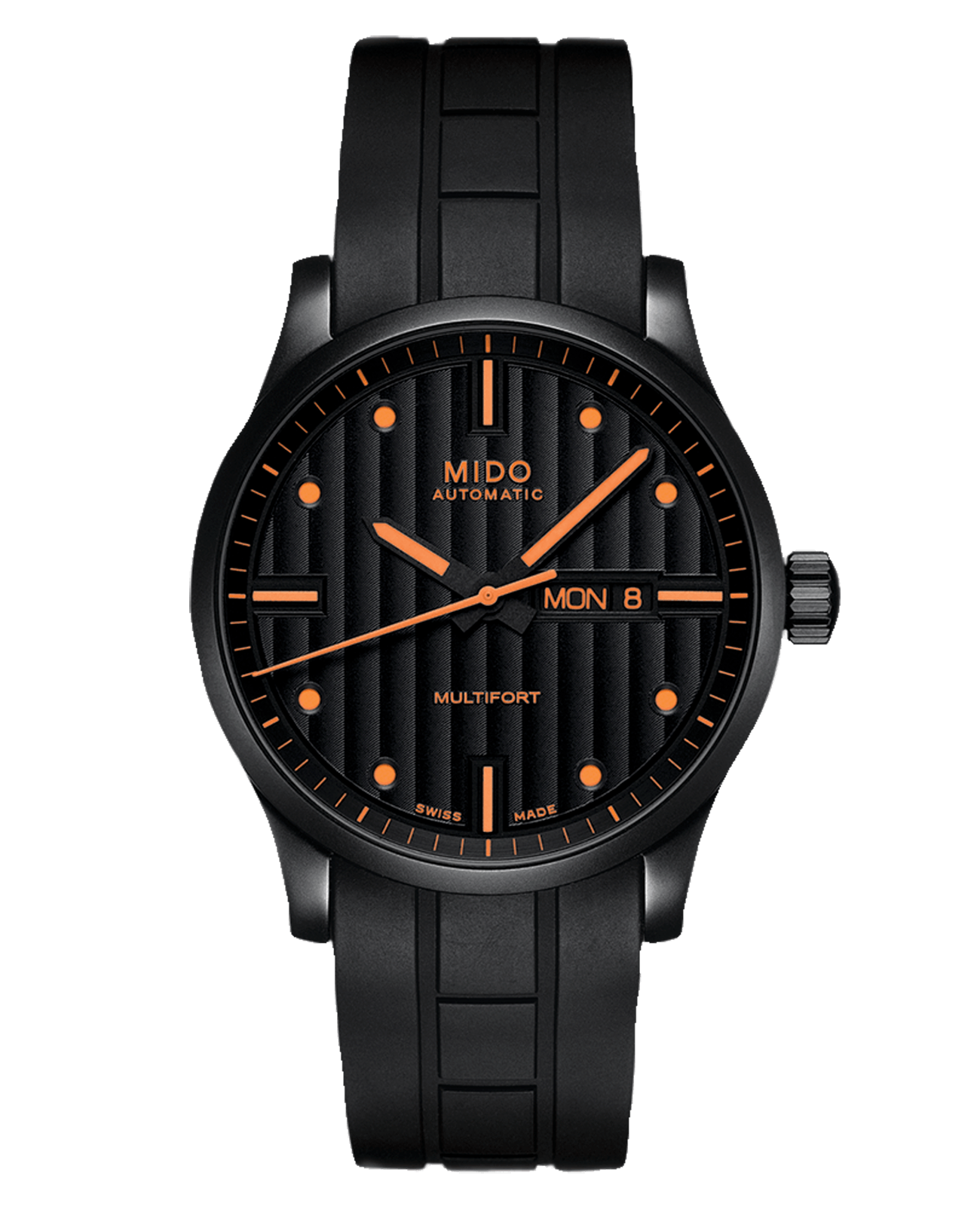 Мужские швейцарские механические часы Mido Multifort Gent M005.430.37.051.80, механический механизм (автоматический калибр) с высокой точностью. Благодаря трем счетчикам, черному циферблату и оранжевым накладным меткам и стрелкам эти часы-хронографХронографФункция позволяет измерять отрезки времени с особой точностью: часы, минуты, секунды. Верным признаком хронографа является наличие на циферблате 3 дополнительных окошек-счётчиков. Multifort Chronograph Special Edition выглядят чрезвычайно эффектно. Сапфировое стеклоСапфировое стеклоПрочный и надёжный материал из кристалла сапфира синтетического происхождения, характеризующийся особой твёрдостью и устойчивостью к царапинам и повреждениям. устойчивое к появлению царапин, обладающее высокой прозрачностью. Прозрачная задняя крышка, Завинчивающаяся заводная головка. Класс водозащиты: 100 метров, позволит плавать, нырять и заниматься другими водными видами спорта. Корпус часов изготовлен из стали, с PVDPVDУльтратонкое покрытие наносится в технике вакуумного напыления, сочетает в себе нитрид титана особой прочности со слоем золота или оксида хрома. Несёт в себе декоративную или защитную функцию. покрытием черного цвета.