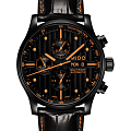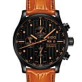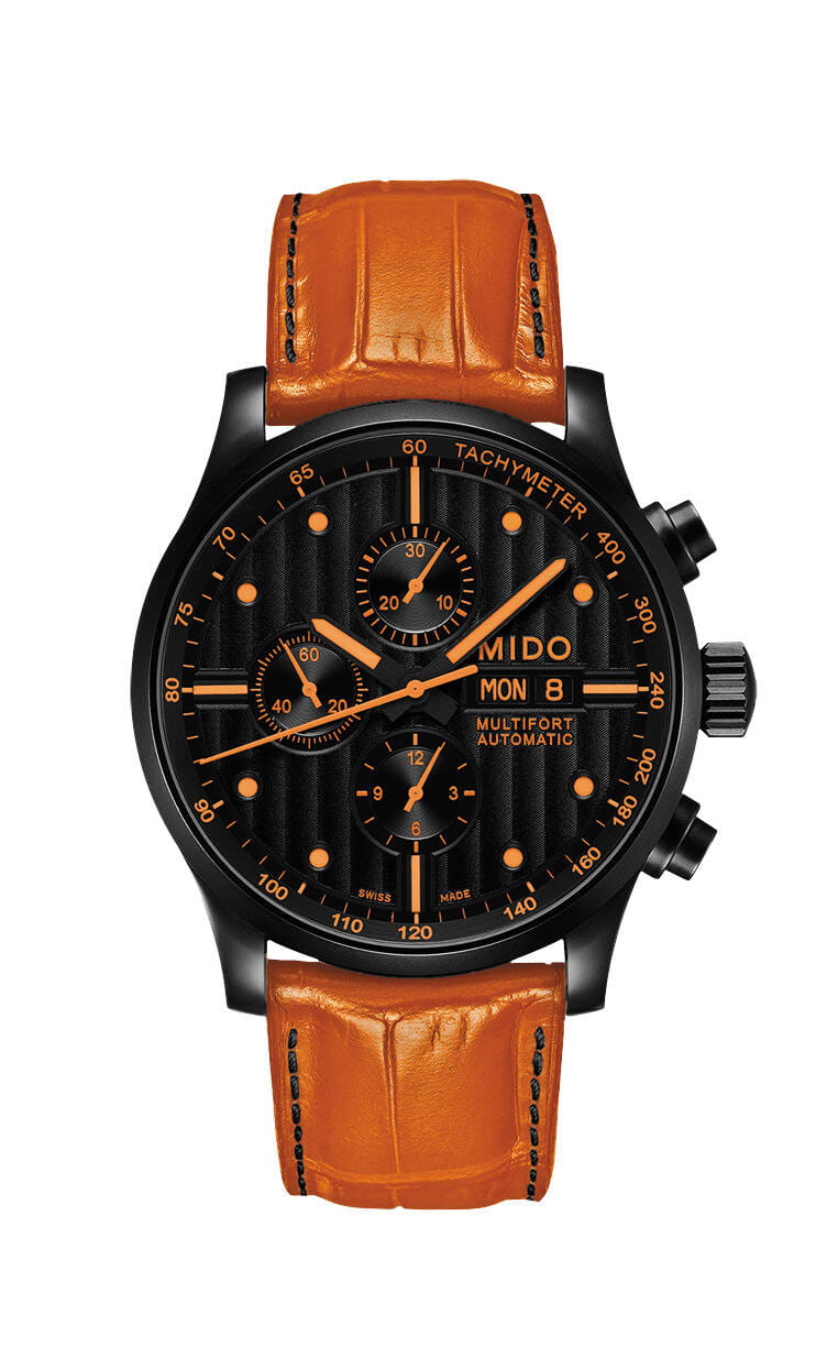 Мужские швейцарские механические часы с хронографом Mido Multifort Chronograph M005.614.36.051.22, механический механизм (автоматический калибр) с высокой точностью. Благодаря трем счетчикам, черному циферблату и оранжевым накладным меткам и стрелкам эти часы-хронограф Multifort Chronograph Special Edition выглядят чрезвычайно эффектно. Сапфировое стекло устойчивое к появлению царапин, обладающее высокой прозрачностью. Класс водозащиты: 100 метров, позволит плавать, нырять и заниматься другими водными видами спорта. Корпус часов изготовлен из стали, с PVD покрытием черного цвета. Прозрачная задняя крышка, завинчивающаяся заводная головка. Часы предлагаются в комплекте с двумя сменными ремешками черного и оранжевого цвета.