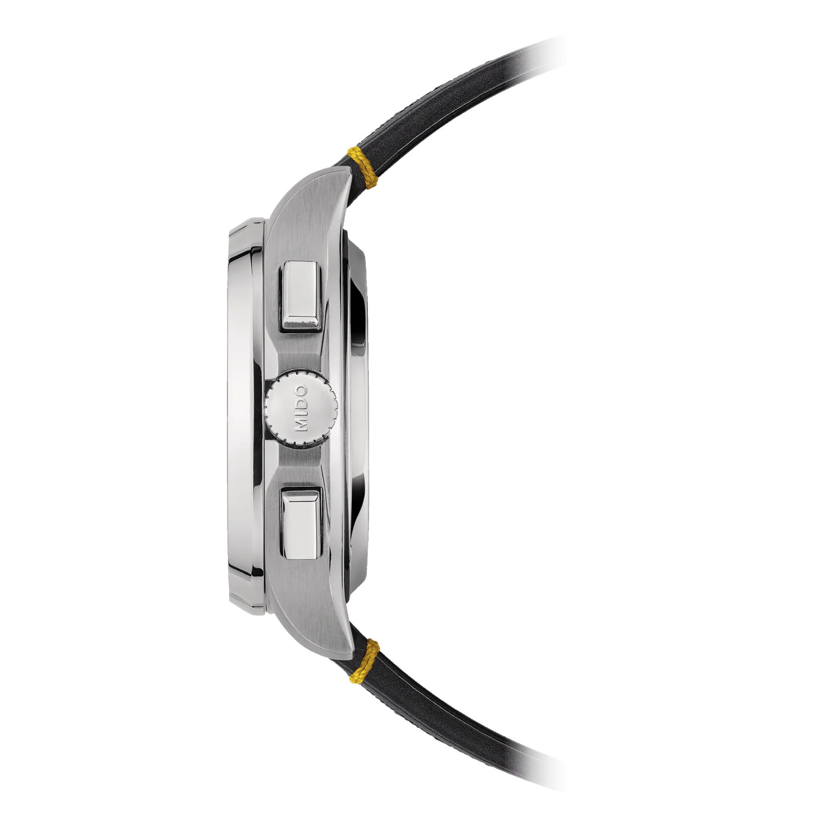 Мужские механические швейцарские часы Mido Multifort TV Chronograph M049.527.11.081.00, механический механизм с высокой точностью. Сапфировое стеклоСапфировое стеклоПрочный и надёжный материал из кристалла сапфира синтетического происхождения, характеризующийся особой твёрдостью и устойчивостью к царапинам и повреждениям. устойчивое к появлению царапин, обладающее высокой прозрачностью. Корпус часов изготовлен из нержавеющей стали. В механизм внедрена пружина баланса Nivachron™Nivachron™Специально разработанный инновационный сплав Nivachron™ повышает устойчивость часов к воздействию магнитных полей.. Стрелки с люминесцентным покрытиемЛюминесцентное покрытиеПозволяет считывать показания времени в темноте. Производители наносят на стрелки, часовые индексы, безель или поверхность циферблата светонакопительный состав, дающий холодное свечение.. Окошко даты в положении между 4 и 6 часами. Класс водозащиты: 100 метров, позволит плавать, нырять и заниматься другими водными видами спорта. Стальной браслет на раскладной застёжкеРаскладная застёжкаТакой тип застёжки используется только на браслетах из металла. Она никогда не раскрывается полностью, происходит разделение на 2 и более частей. Раскладывающая застёжка снизит вероятность потери часов к минимуму.. Часы с функциями хронографаХронографФункция позволяет измерять отрезки времени с особой точностью: часы, минуты, секунды. Верным признаком хронографа является наличие на циферблате 3 дополнительных окошек-счётчиков. и тахиметраТахиметрРазмеченная шкала, располагается на ободке или безеле часов. Тахиметр позволяет рассчитать скорость на определённом участке пути, расстояние измеряется в километрах или милях..Поставляются с дополнительным ремешком, что обеспечивает еще большую универсальность и комфорт.