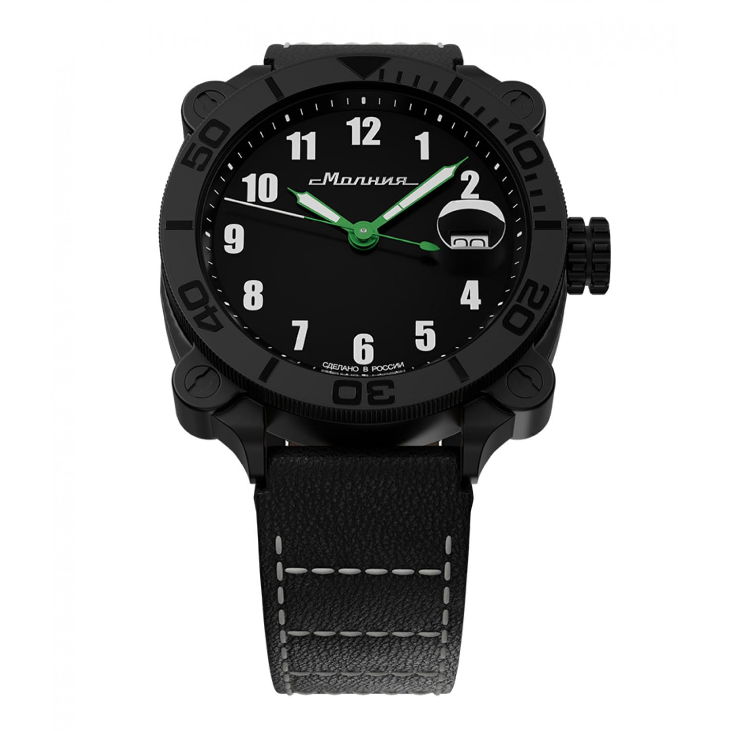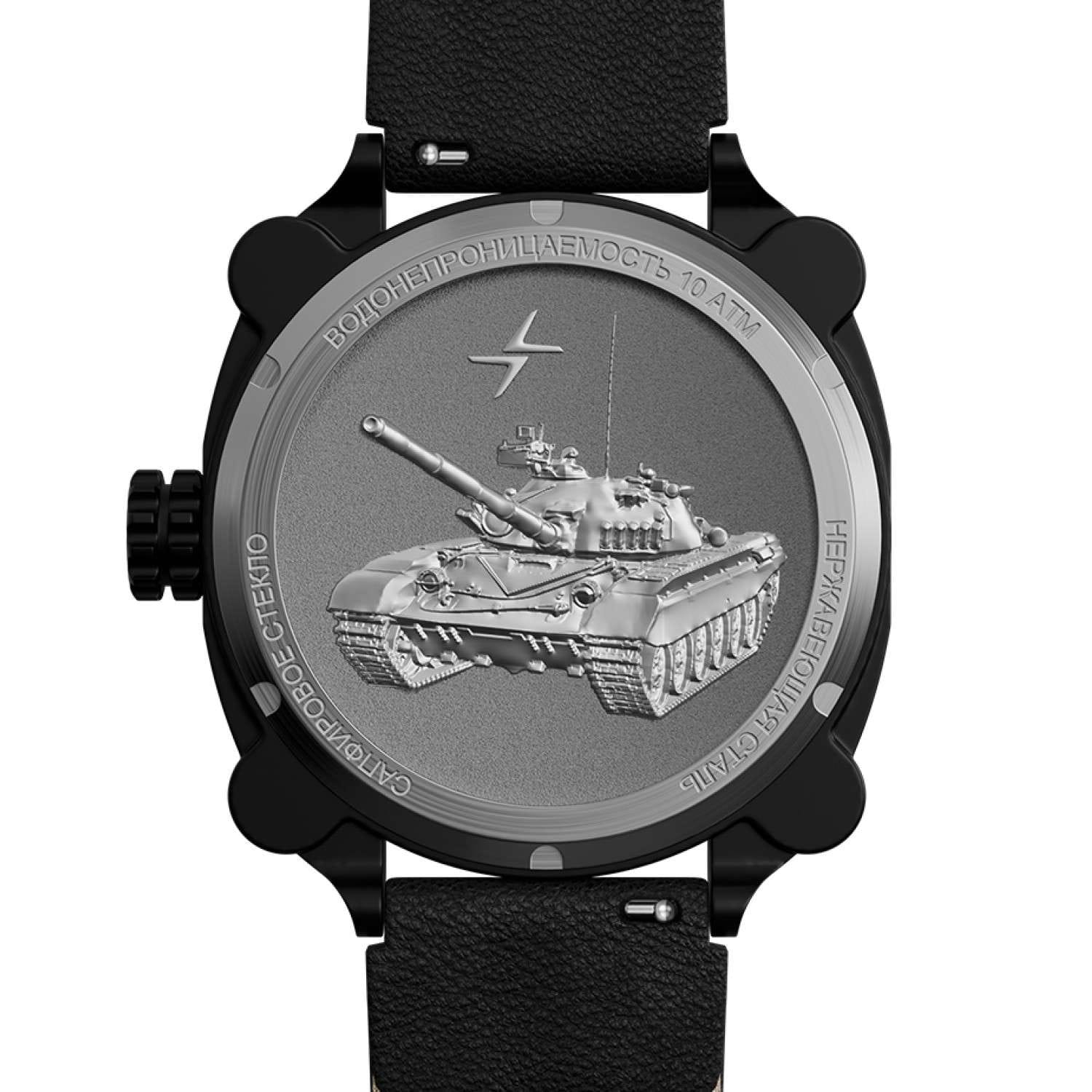 Мужские механические часы с автоподзаводом от бренда «МОЛНИЯ» — это стильный аксессуар, вдохновлённый дизайном приборной панели легендарного танка Т-72. Корпус диаметром 42 мм и толщиной 12 мм выполнен из нержавеющей стали 316L с IP-покрытиемIP-покрытиеМетод ионного напыления. Демонстрирует повышенную устойчивость к истиранию, окислению и химическим веществам. Под воздействием высокого давления и температуры около 1500°C молекулы металла надёжно соединяются с частицами корпуса часов.. БезельБезельВнешний ободок, закрепляющий стекло. В спортивных часах так называется поворотное кольцо с делениями на циферблате, выполняет роль таймера – замеряет отрезки времени на шкале. Неподвижный безель – элемент декора. Однонаправленно вращающийся безель на дайверских часах позволяет фиксировать моменты погружения и выныривания на поверхность. однонаправленный, вращающийся. Циферблат чёрного цвета оформлен арабскими цифрами и логотипом бренда. Окошко даты расположено в положении 3 часов и оснащено увеличительным стеклом. Стрелки и метки с люминесцентным покрытиемЛюминесцентное покрытиеПозволяет считывать показания времени в темноте. Производители наносят на стрелки, часовые индексы, безель или поверхность циферблата светонакопительный состав, дающий холодное свечение. Super-LumiNova. Циферблат защищён сапфировым стекломСапфировое стеклоПрочный и надёжный материал из кристалла сапфира синтетического происхождения, характеризующийся особой твёрдостью и устойчивостью к царапинам и повреждениям. с антибликовым покрытиемАнтибликовое покрытиеСлой оксида металла в 0,13-0,3 микрон, благодаря которому стекло часов не бликует и не отражает свет. Антибликовое покрытие уменьшает отражение света в 10 раз, обеспечивая отличную читаемость показателей циферблата.. Механизм — Русский автоматический калибр Восток 2416 запас хода до 42 часов. Заводная головка стилизована под гусеничную ленту, задняя крышка с гравировкой танка. Часы оснащены кожаным ремешком чёрного цвета с классической пряжкой и системой быстрой замены. Водонепроницаемость 100 м позволяет использовать часы для плавания и повседневного ношения. Идеальный выбор для тех, кто ценит инженерное наследие и мощный дизайн.