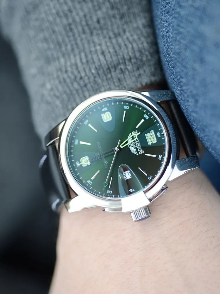 Ремешок выполнен из натуральной кожи чёрного цвета, обеспечивая комфорт при носке.  Толщина корпуса составляет 13 мм, что придаёт часам солидный вид.  Гарантия на модель составляет 2 года.