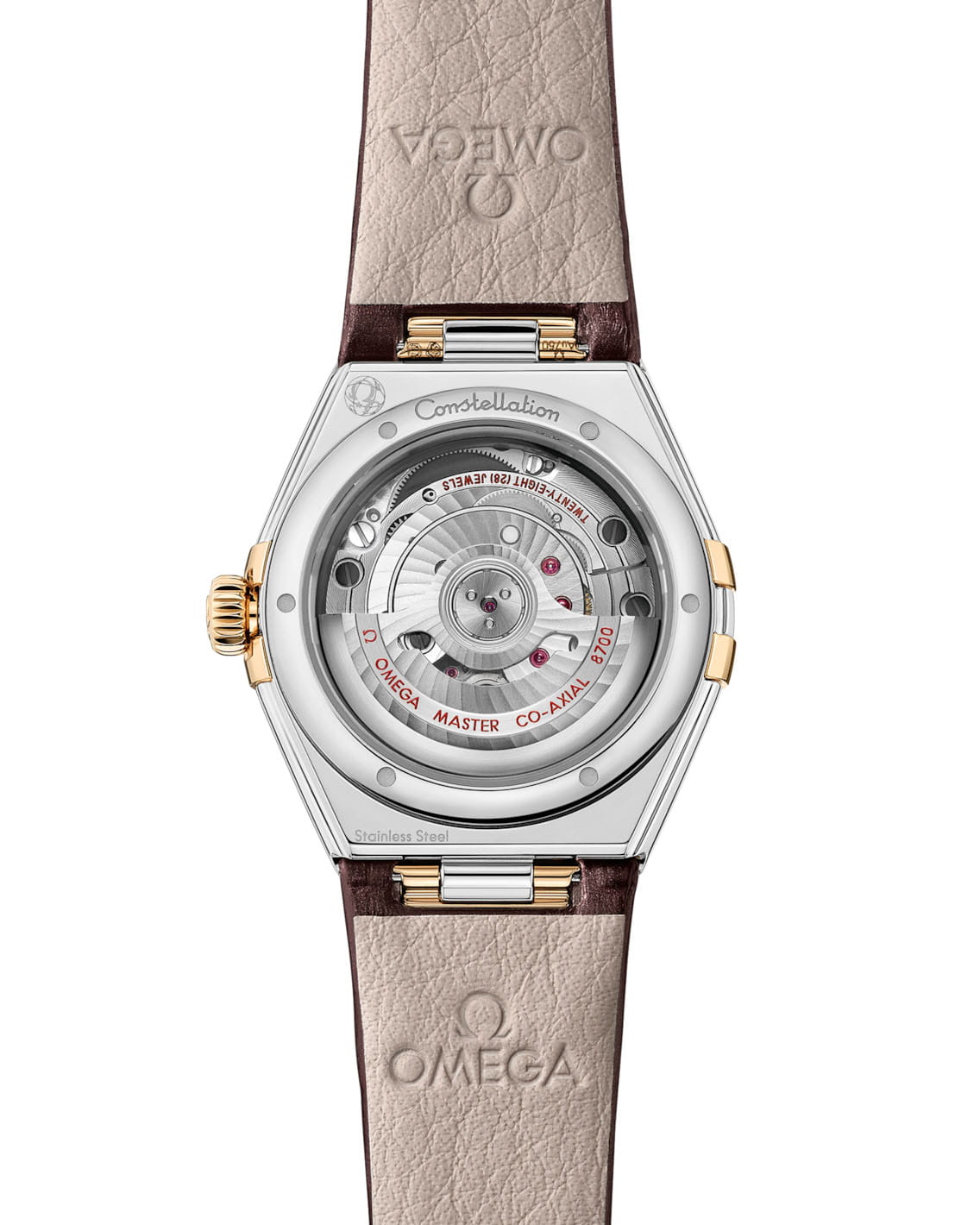 Moonshine™, а также бриллиантовые метки в золотых оправах, сверкающие подобно созвездиям. Часы дополнены роскошным коричневым кожаным ремешком с благородным блеском, а их сердцем выступает коаксиальный хронометр OMEGA Master Chronometer 8700, чье совершенство раскрывается через кристально прозрачное сапфировое стеклоСапфировое стеклоПрочный и надёжный материал из кристалла сапфира синтетического происхождения, характеризующийся особой твёрдостью и устойчивостью к царапинам и повреждениям. задней крышки.