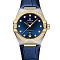 оснащена полированным безелемБезельВнешний ободок, закрепляющий стекло. В спортивных часах так называется поворотное кольцо с делениями на циферблате, выполняет роль таймера – замеряет отрезки времени на шкале. Неподвижный безель – элемент декора. Однонаправленно вращающийся безель на дайверских часах позволяет фиксировать моменты погружения и выныривания на поверхность. с 38 бриллиантами, синим циферблатом с PVDPVDУльтратонкое покрытие наносится в технике вакуумного напыления, сочетает в себе нитрид титана особой прочности со слоем золота или оксида хрома. Несёт в себе декоративную или защитную функцию.-покрытием, матовым покрытием от солнца и окошком даты в положении «6 часов». Стрелки, логотип OMEGA, звезда Созвездия и индексы выполнены из желтого золота 18 карат18-каратное золотоОбозначение по каратной системе пробирования, оно показывает, сколько драгоценного металла содержится в изделии. 18 карат - в составе 75% чистого золота, соответствует 750 пробе.