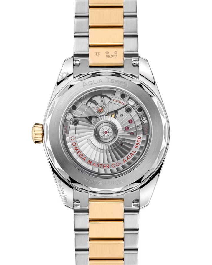 Omega Seamaster Aqua Terra выполнены в симметричном корпусе из нержавеющей стали и 18K Sedna™ золота с завинчивающейся задней крышкой, украшенной волновым узором. Циферблат дополнен окошком даты на 6 часах. Стрелки и метки оснащены люминесцентным покрытиемЛюминесцентное покрытиеПозволяет считывать показания времени в темноте. Производители наносят на стрелки, часовые индексы, безель или поверхность циферблата светонакопительный состав, дающий холодное свечение. Super-LumiNova для лучшей читаемости в темноте. Калибр Omega 8800 сертифицирован как Master Chronometer — гарантия высочайшей точности и устойчивости к магнитным полям. Запас хода составляет 55 часов. Защиту циферблата обеспечивает сапфировое стеклоСапфировое стеклоПрочный и надёжный материал из кристалла сапфира синтетического происхождения, характеризующийся особой твёрдостью и устойчивостью к царапинам и повреждениям. с антибликовым покрытиемАнтибликовое покрытиеСлой оксида металла в 0,13-0,3 микрон, благодаря которому стекло часов не бликует и не отражает свет. Антибликовое покрытие уменьшает отражение света в 10 раз, обеспечивая отличную читаемость показателей циферблата.. Водозащита позволяет использовать часы в воде без риска повреждения. Часы установлены на комбинированный браслет из 18K Sedna™ золота и нержавеющей стали с застёжка «бабочка» с кнопкамиЗастёжка "бабочка"Такой вид застёжки дополняется предохранителями, помогающими избежать случайного раскрытия браслета. Обладают изящным исполнением. . Это сочетание премиального качества, технологичности и классического дизайна.