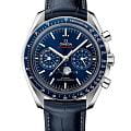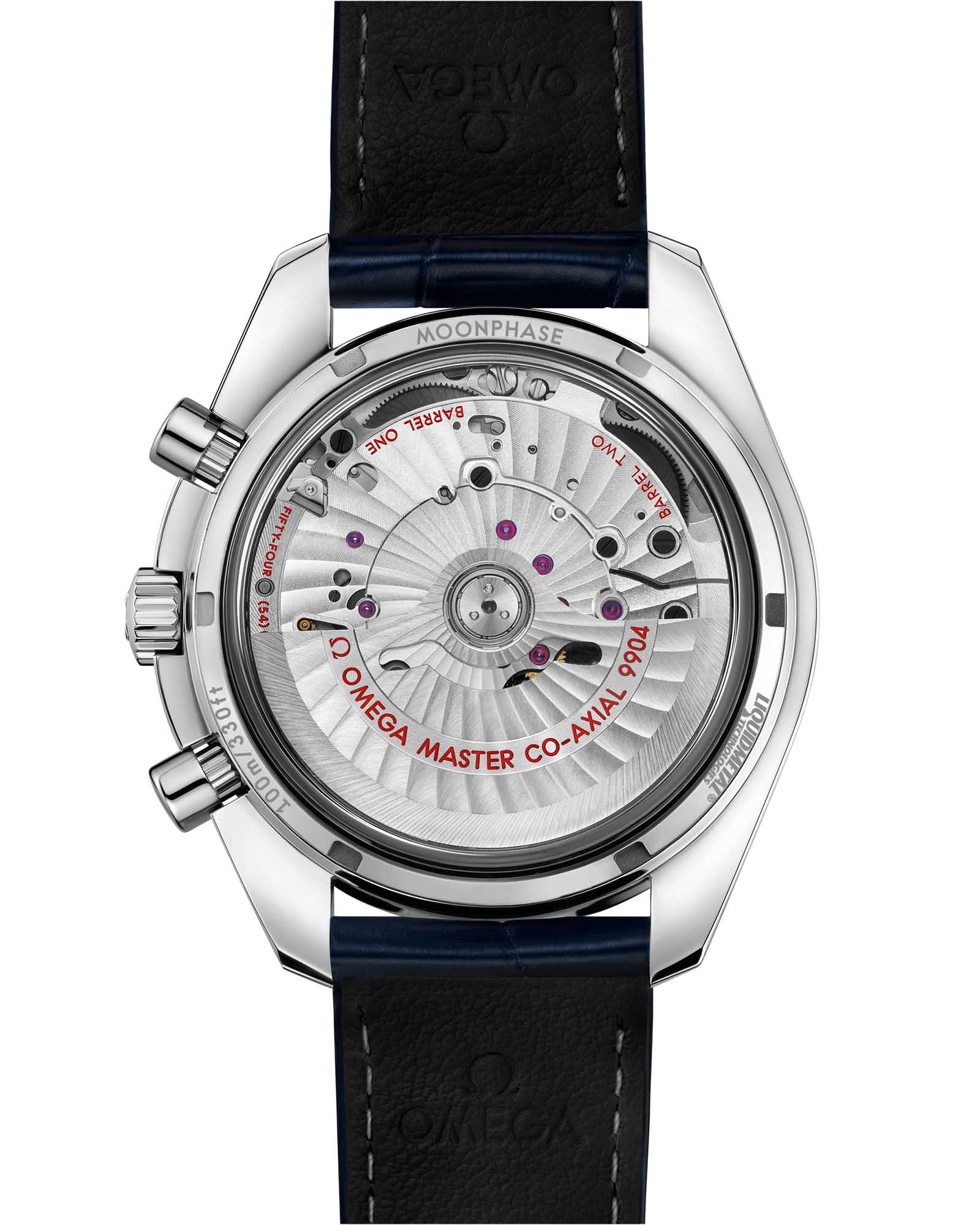 Speedmaster Moonphase воплощает космическое наследие OMEGA, представив уникальную модель с двумя невероятно детализированными изображениями Луны. 44,25-мм корпус из нержавеющей стали с синим керамическим безелемБезельВнешний ободок, закрепляющий стекло. В спортивных часах так называется поворотное кольцо с делениями на циферблате, выполняет роль таймера – замеряет отрезки времени на шкале. Неподвижный безель – элемент декора. Однонаправленно вращающийся безель на дайверских часах позволяет фиксировать моменты погружения и выныривания на поверхность., украшенным тахиметрической шкалойТахиметрРазмеченная шкала, располагается на ободке или безеле часов. Тахиметр позволяет рассчитать скорость на определённом участке пути, расстояние измеряется в километрах или милях. из Liquidmetal™, сочетается с синим кожаным ремешком и полированной застежкой. Синий циферблат с радиальным сатинированием и индексами с родиевым покрытием дополнен уникальным указателем фаз Луны на "6 часах", где лунный диск из металлизированного хрусталя с микроструктурой поражает реалистичностью. Прецизионный механизм OMEGA Co-Axial Master Chronometer 9904 с сертификатом METAS продолжает традиции космической точности.