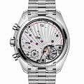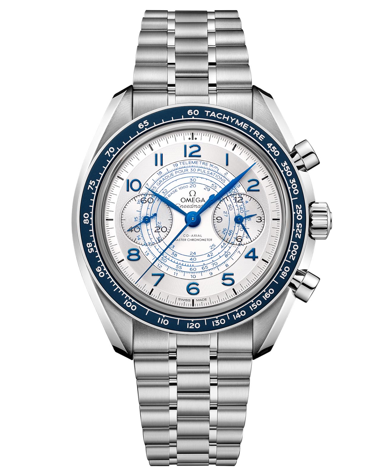 Chronoscope воплощает дух винтажных хронографов OMEGA 1940-х, мастерски переосмысленный через призму легендарного Speedmaster. 43-мм корпус из нержавеющей стали с синим безелемБезельВнешний ободок, закрепляющий стекло. В спортивных часах так называется поворотное кольцо с делениями на циферблате, выполняет роль таймера – замеряет отрезки времени на шкале. Неподвижный безель – элемент декора. Однонаправленно вращающийся безель на дайверских часах позволяет фиксировать моменты погружения и выныривания на поверхность. из анодированного алюминия представляет серебристый циферблат, украшенный тахиметрической шкалойТахиметрРазмеченная шкала, располагается на ободке или безеле часов. Тахиметр позволяет рассчитать скорость на определённом участке пути, расстояние измеряется в километрах или милях. и спиралевидным узором. Синие стрелки в форме листьев и арабские цифры добавляют характерный ретро-акцент. Три исторические шкалы в форме улитки - тахиметрическая, пульсометрическая и телеметрическая - создают уникальный измерительный комплекс. Функциональные счетчики на 3 и 9 часах гармонично интегрированы в дизайн. Браслет из нержавеющей стали завершает образ, а калибр OMEGA Co-Axial Master Chronometer 9908 гарантирует прецизионную точность, соединяя наследие с инновациями.