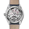 De Ville Trésor — современная интерпретация легендарной коллекции 1949 года, где традиции встречаются с инновациями. 40-мм корпус из нержавеющей стали с бриллиантовым безелемБезельВнешний ободок, закрепляющий стекло. В спортивных часах так называется поворотное кольцо с делениями на циферблате, выполняет роль таймера – замеряет отрезки времени на шкале. Неподвижный безель – элемент декора. Однонаправленно вращающийся безель на дайверских часах позволяет фиксировать моменты погружения и выныривания на поверхность. и синим кожаным ремешком воплощает изысканную простоту. Выпуклый синий циферблат с изящным узором украшен стрелками и индексами из белого золота18-каратное золотоОбозначение по каратной системе пробирования, оно показывает, сколько драгоценного металла содержится в изделии. 18 карат - в составе 75% чистого золота, соответствует 750 пробе.