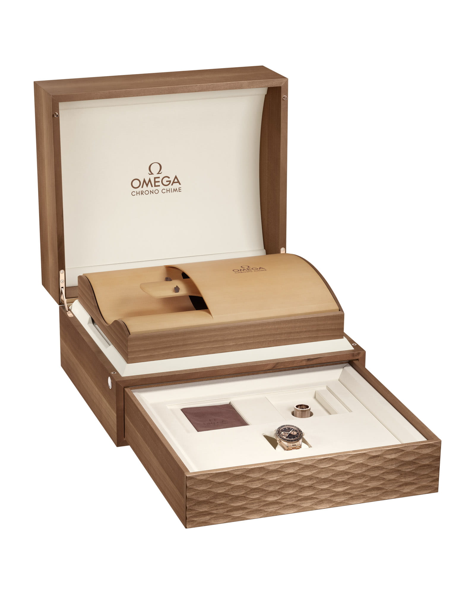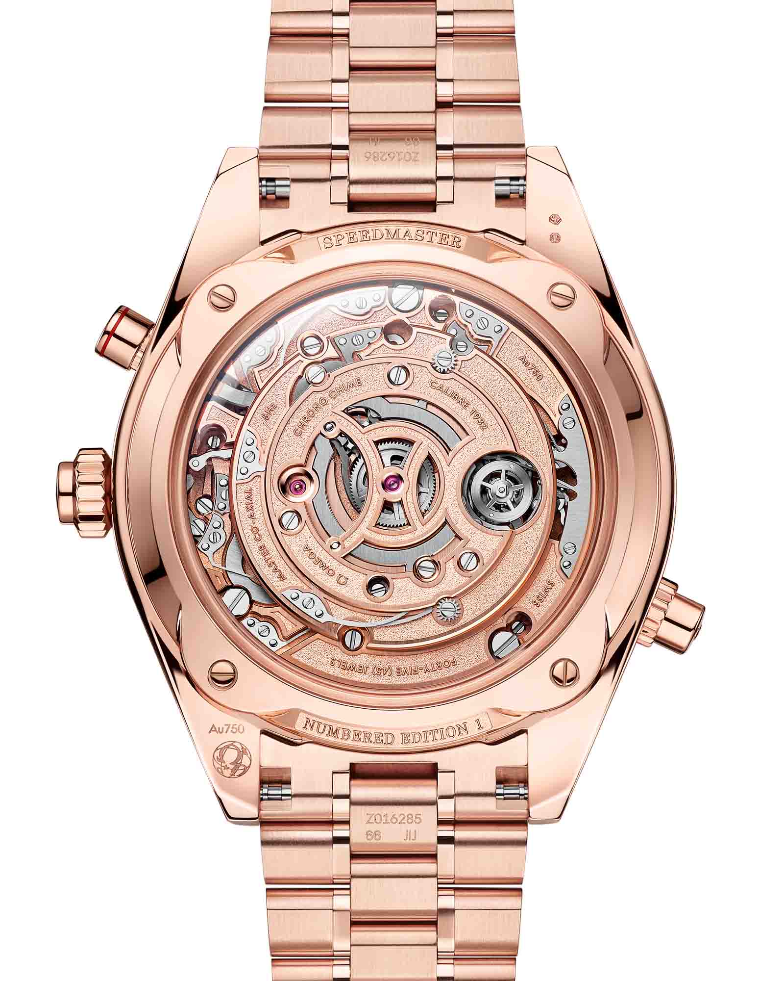 Chrono Chime — вершина часового искусства OMEGA в 45-мм корпусе из 18-каратного золота Sedna™18-каратное золотоОбозначение по каратной системе пробирования, оно показывает, сколько драгоценного металла содержится в изделии. 18 карат - в составе 75% чистого золота, соответствует 750 пробе.