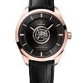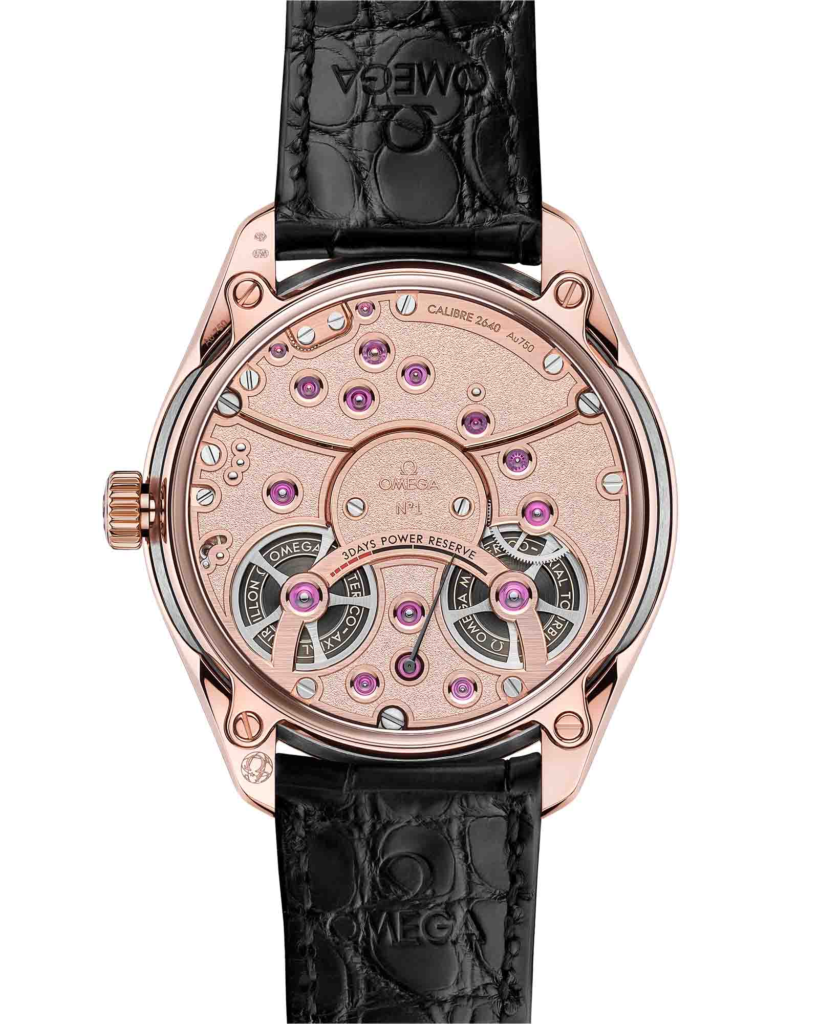 , безелем из 18-каратного золота Sedna™ и циферблатом из этого же сияющего материала с отделкой "солнечные лучи" и черным PVD-покрытиемPVDУльтратонкое покрытие наносится в технике вакуумного напыления, сочетает в себе нитрид титана особой прочности со слоем золота или оксида хрома. Несёт в себе декоративную или защитную функцию.. Индексы, а также полированные минутная и часовая стрелки выполнены из 18-каратного золота Sedna™. Полированная секундная стрелка из 18-каратного золота Sedna™ размещена на титановом мосте турбийона. Заводная головка, также выполненная из полированного 18-каратного золота Sedna™, украшена символом Ω из 18-каратного золота Canopus Gold™. Эти исключительные часы, яркий пример часового искусства, дополнены черным кожаным ремешком с застежкой из 18-каратного золота Sedna™. Сквозь заднюю крышку из сапфирового стеклаСапфировое стеклоПрочный и надёжный материал из кристалла сапфира синтетического происхождения, характеризующийся особой твёрдостью и устойчивостью к царапинам и повреждениям. можно наблюдать за работой механизма из 18-каратного золота Sedna™: OMEGA Co-Axial Master Chronometer Calibre 2640.